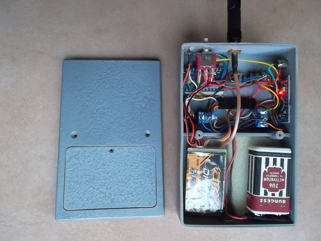 The transmitter uses two Arduino pro-minis, one for the pulse generator and one for the display. HF comes from an Orange 2.4GHz module and power is a 2s PP3 lipo.