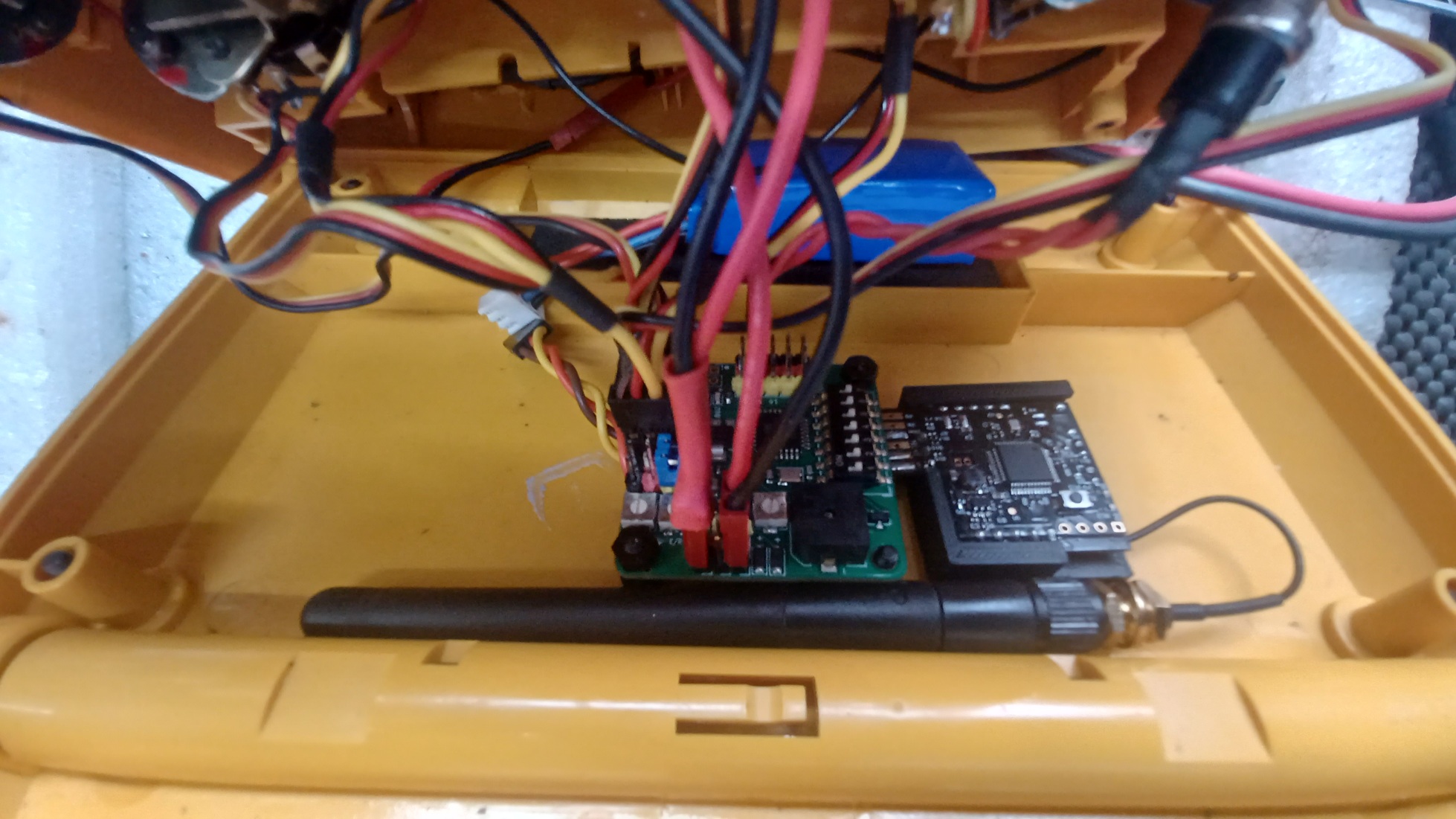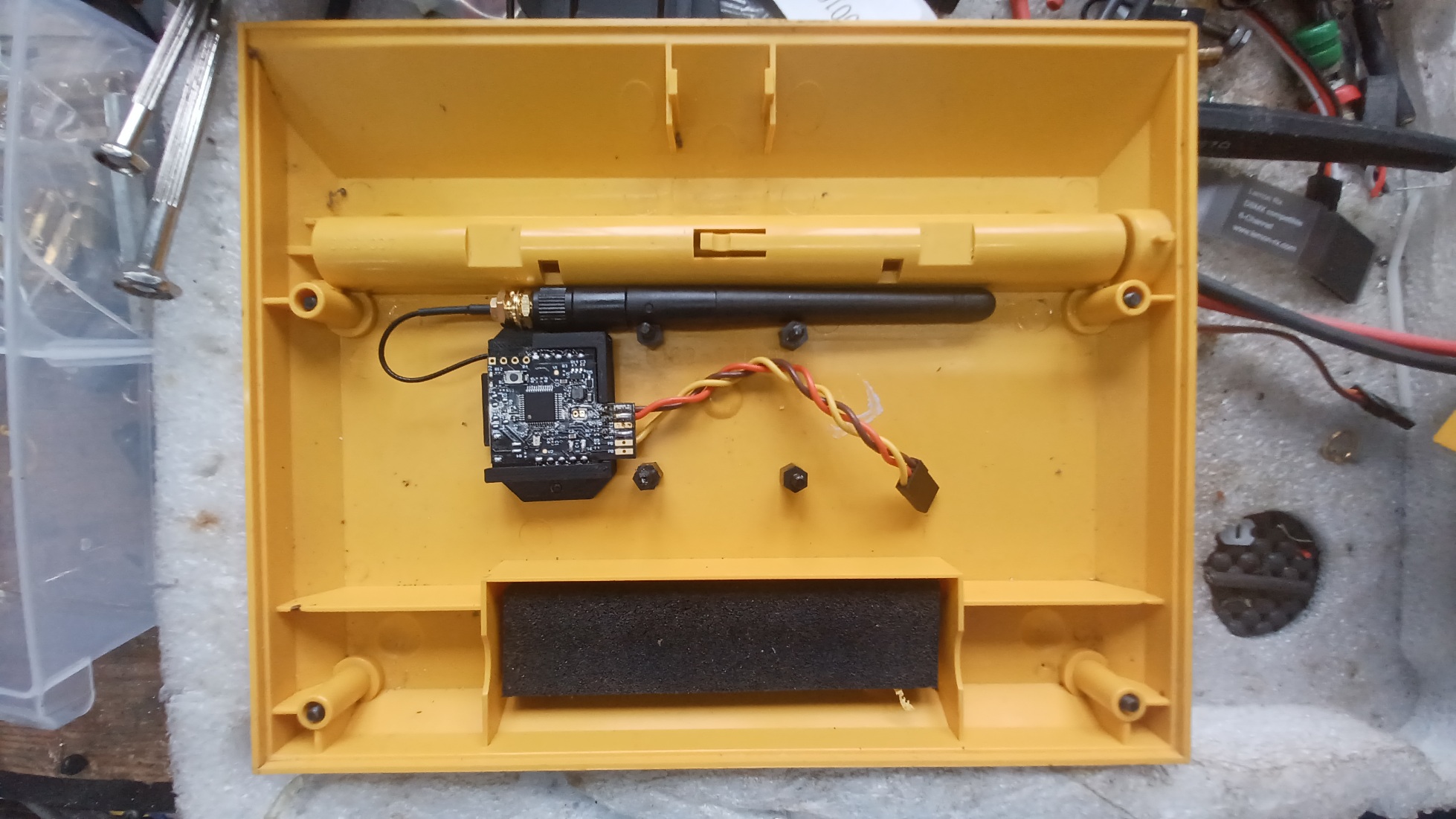 I used the hard plastic Lemon RF module mount https://www.ebay.co.uk/itm/134615248001 and tapped the mounting holes to M3 which allows it to be screwed to the back panel using two plastic screws. I thought about installing the 2.4 antenna within the original antenna mounting tube but elected to lay it in the back of the case and being as the case is plastic, it shouldnt affect the range adversely.