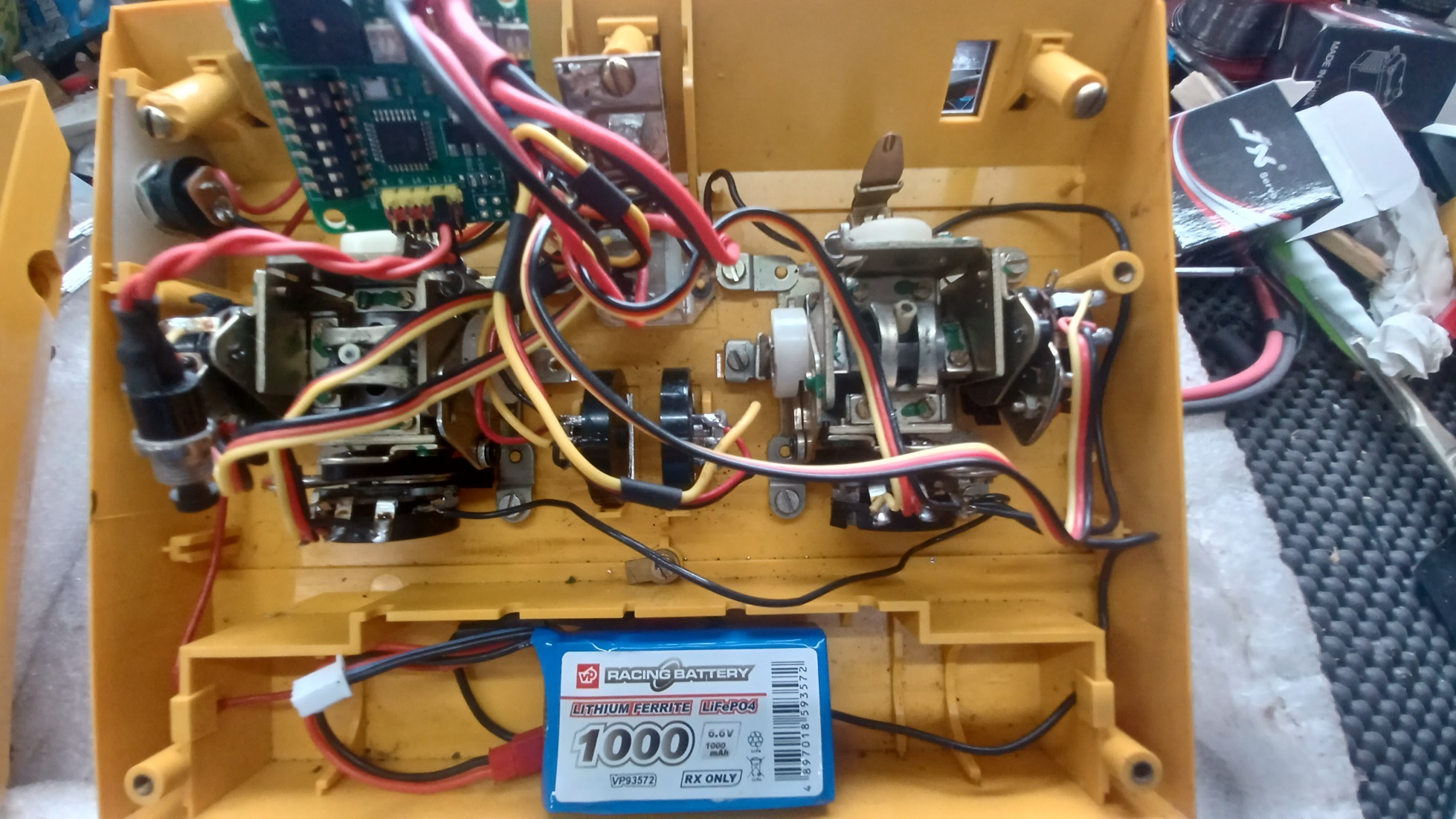 After adding new JR plugs to the original stick pot wiring, it soon became clear that the GTS Encoder needed to live near where the two centre aux channel controls are located, but there was no space to accommodate this so a plan was hatched and the encoder and Lemon module have been located on the rear panel of the case and fixed in place with plastic standoff and screws. The battery lives in the original DEAC bay.