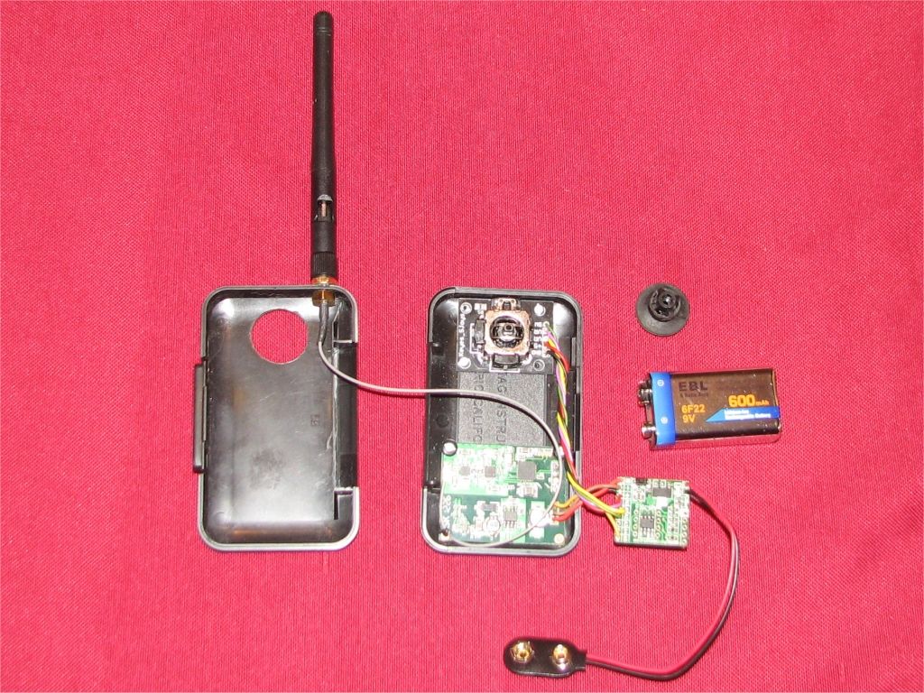 The bits I had were a V8HT Frsky RF module, a little plastic case from a Maglite Solitaire torch, a PP3 2S life battery, a PlayStation-style propo joystick with left-right, up-down & press (which I'll use for trim), and an iPC07 PIC processor board (same hardware as the Tiny-6 reeds emulation encoder). The Kraft is just for size reference: