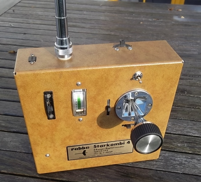Single Stick Radios are very uncommon in our country. Here are two examples from my collection. Both are robbe / Futaba radios and are converted to 35MHz.