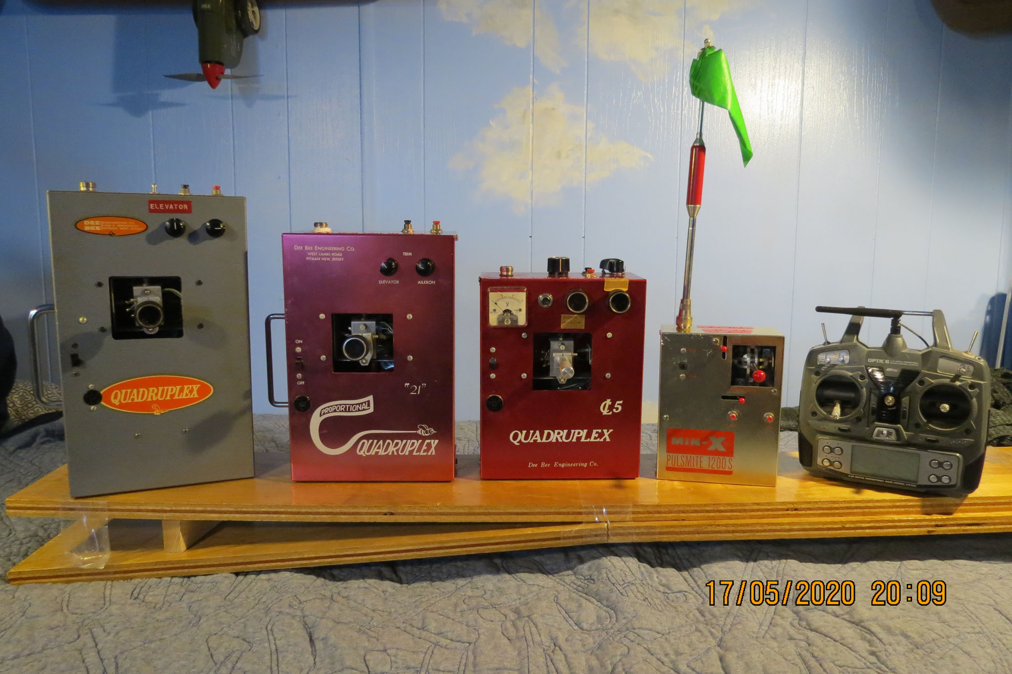 I think you'll find the Min-X transmitter is a Galloping Ghost Tx. The two Quadruplex' on the left are the original "open-loop" waggling ones, that didn't use feedback servos. IIRC they used modified Graupner Bellamatics, and worked by varying the mark-space ration of four separate channels - a sort of upmarket Galloping Ghost, but with a much higher frame rate.