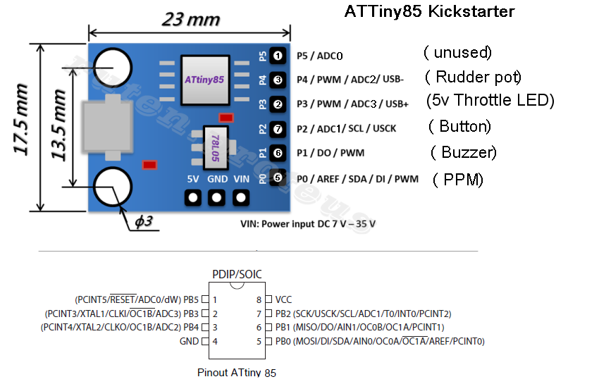 This emulation adds a few facilities over Macgregors original, all of which are optional but I think should prove useful in practise. Its basically a stripped-down edit of the 7ch encoder, with Franks throttle idea and some "1+1 specific" bells & whistles added: Auto stick calibration, throttle position confirmed by an LED which is off for low, flashing fast for mid (where next speed is high), solid for high throttle, and flashing slow for mid (where next speed is low). There is also a buzzer which pips once for low, twice for mid and three times for high throttle. We have rudder subtrim, by holding the stick over in the required direction whilst dabbing the throttle button. Trim is saved to flash memory. It has a presettable mid-throttle position, so it no longer needs to be exactly 'half' - half throttle sometimes doesnt suit a model, it may be a bit too low or too high to maintain a steady cruising height. IC engines rarely have a linear throttle response, and the half setting might well give 80% power.
