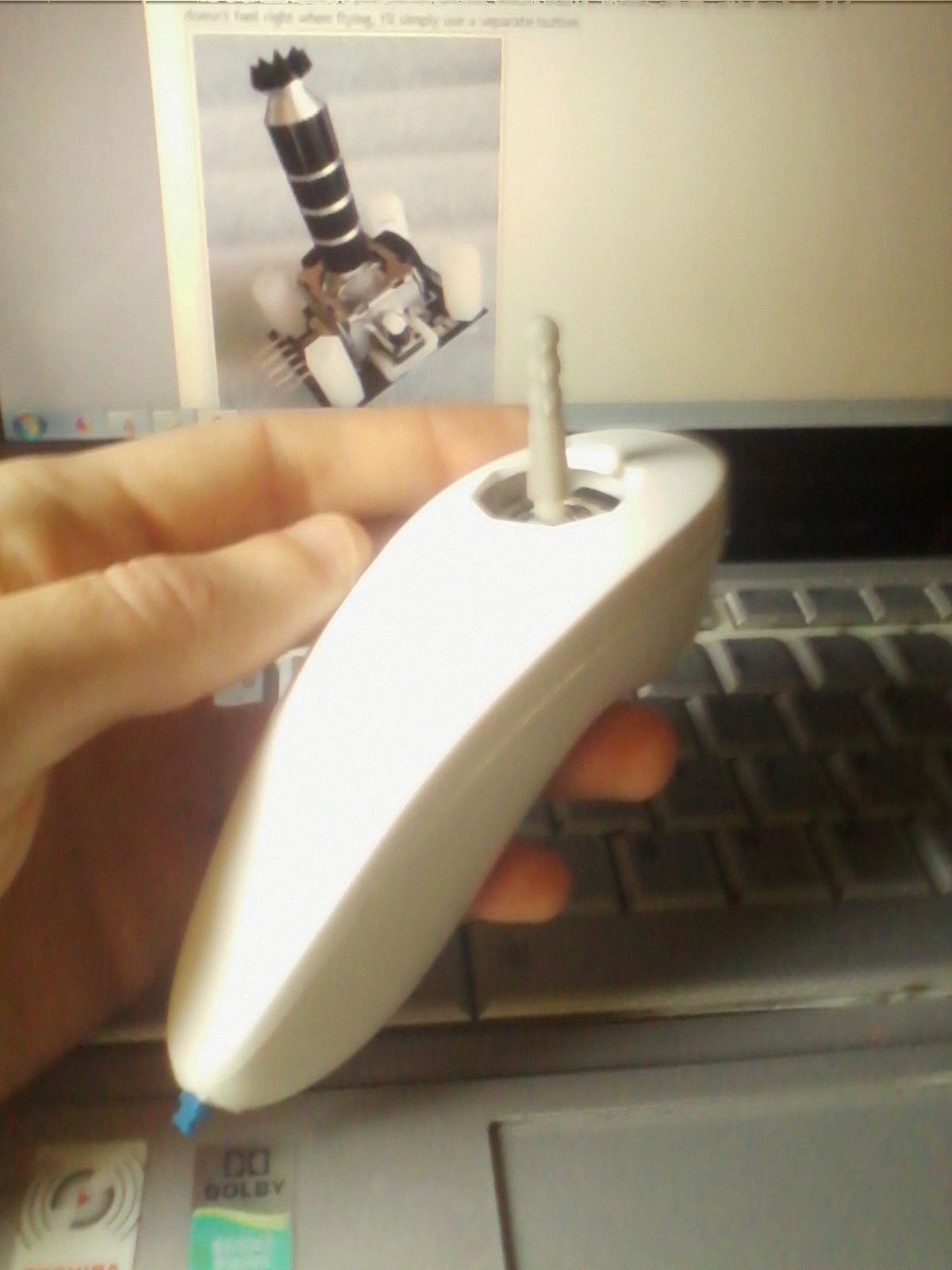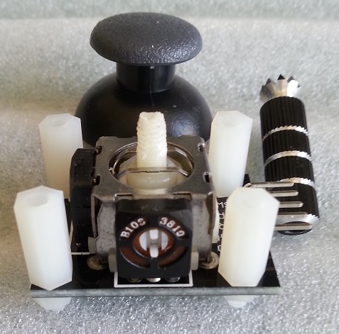 the original 'gamer' knob in the background, plastic shaft threaded 4mm for the "bling" stick extension. The stick shaft has a 1.5mm hole down its axis, which I deepened and glued a piece of wire into to make the whole assembly a bit stronger (I hope!?!).