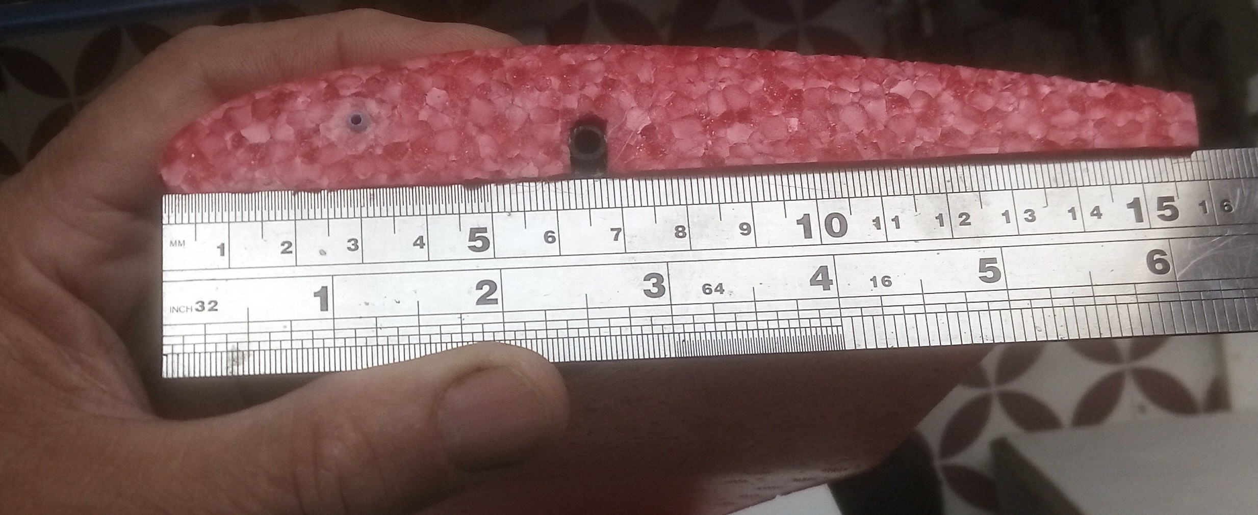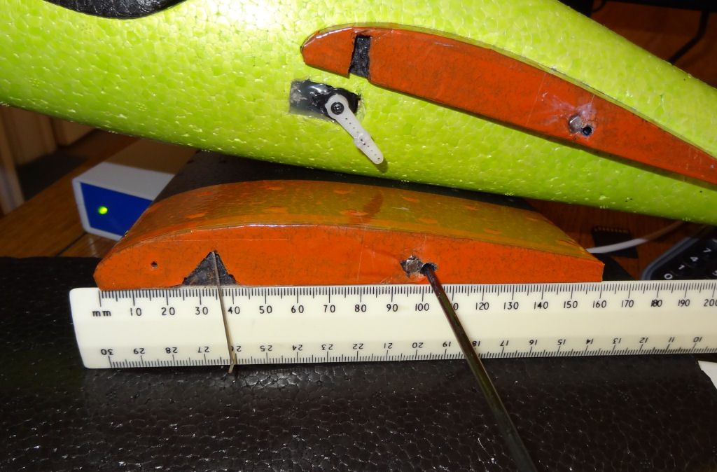 With hindsight, I put the 'spar' (pivot axle) too far back on my Lidl wingeron, and the place where the control rod to the servo entered the wing a little too far forward. I test flew it and it was controllable but even with the transmitter throws maxed out it was not very responsive. Rather than remake the wing pivots, I just fabricated some extra-long servo arms by cutting one long arm off a servo and fastening it on to the end of the other long arm. I now get slightly more wing travel than is shown in Phil's video.
