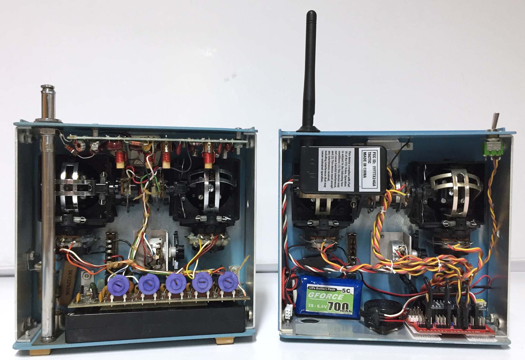 The conversion to Arduino of the first Heathkit GD-19 is a success! I just got done completing a short test flight of an electric PBF foamie in my yard, and it worked perfectly. The one on the left is a future conversion project, and the one on the right is my first conversion. The encoder is a Nano on a modified redboard shield. The RF section is an original Anylink. The software is Phil Green's 7 Channel Encoder sketch, with some modifications for dual aileron servos, flapperons, 100:100 elevons, and some other things. The stick pot wiring was scavenged from some dead 9 gram servos, which worked great to plug into the redboard. Extra spektrum bind plugs are used to enable/disable the elevon mixers, the calibration mode, and the channels 5 and 7 swap. The redboard, buzzer, and battery are held in place with velcro for now.......maybe permanently. The switch on the top right is the throttle safety/cutoff, and the one on the left is the flapperon enable/disable. I didn't install a channel 7 switch yet, since I doubt this transmitter will ever be used to fly something that needs 7 channels.