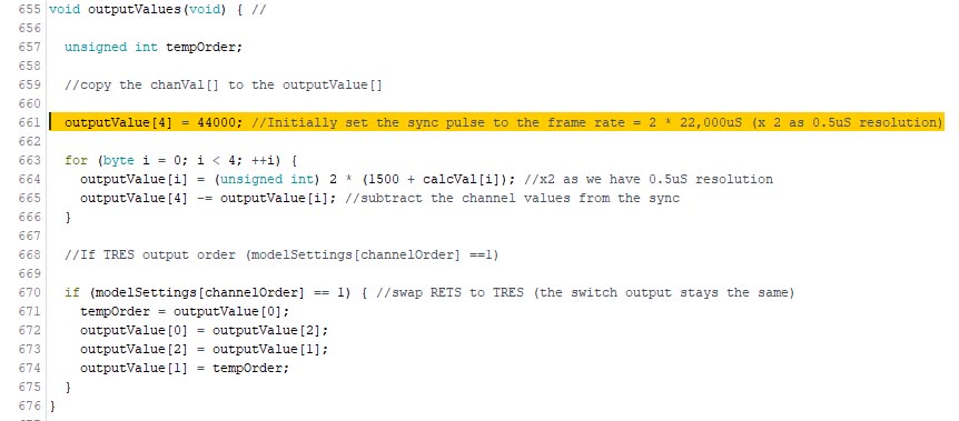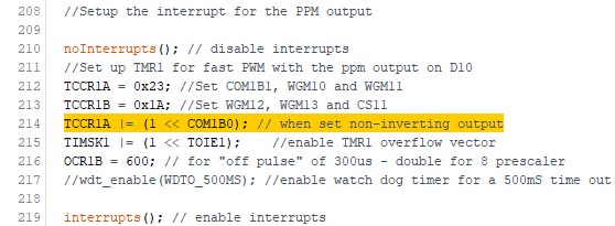 for (int ch=0; ch<7; ch++) {digitalWrite(ppm, LOW); delayMicroseconds(ppmPulse); digitalWrite(ppm, HIGH); delayMicroseconds(channel[ch]);}