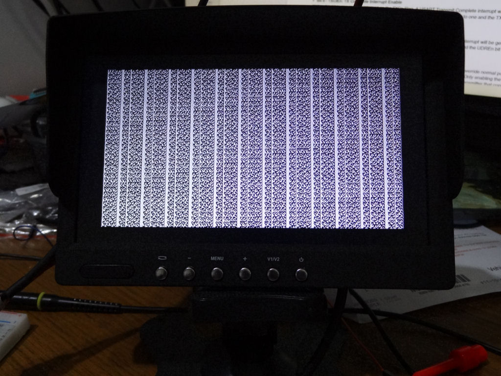 Edit: using assembler, I could get the SPI bytes steady, and next to each other, but the processor isn't fast enough to access the character data then calculate the address and fetch the next byte from the font table in time. Graphics mode is easier for the CPU, but the ATmega328 is hopelessly short of RAM, and even the 2560 only has sufficient RAM for about a quarter of the screen area.