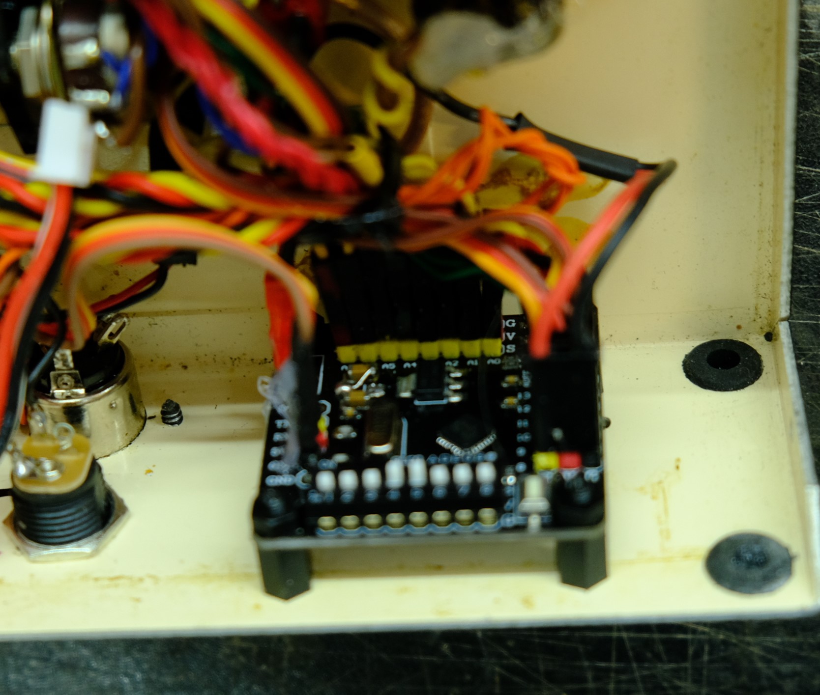 That done, I found it much easier and neater to retain the original wiring harness and land the connections to the Arduino holes and solder them in place. In may cases it reduces the amount of wiring compared with using servo plugs because many radios like Pro-Lines have one wire daisy chained to all the pots for the +5 Volts. The down side is if you have a failure of the Arduino, it has to be unsoldered and re-wired, but that is very rare. Also, in some cases, you are limited by the existing wire harness length as to where you can mount the Arduino.