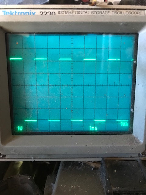 I finally got around to making a divide by 2 circuit using a JK flip flop, an MC14027P. Tied the J and K to positive, S and R to ground, connected the demodulated and squared audio (data pulses) from the receiver to the clock (CK) input of the flip flop and as you can see below, it divided the 1000Hz modulation frequency from my signal generator into 500Hz pulses. I tried to photograph the recovered pulses from the Digi-Ghost Tx, but they are too slow and my camera only catches about one half a pulse so you cannot see the entire sweep of the scope.