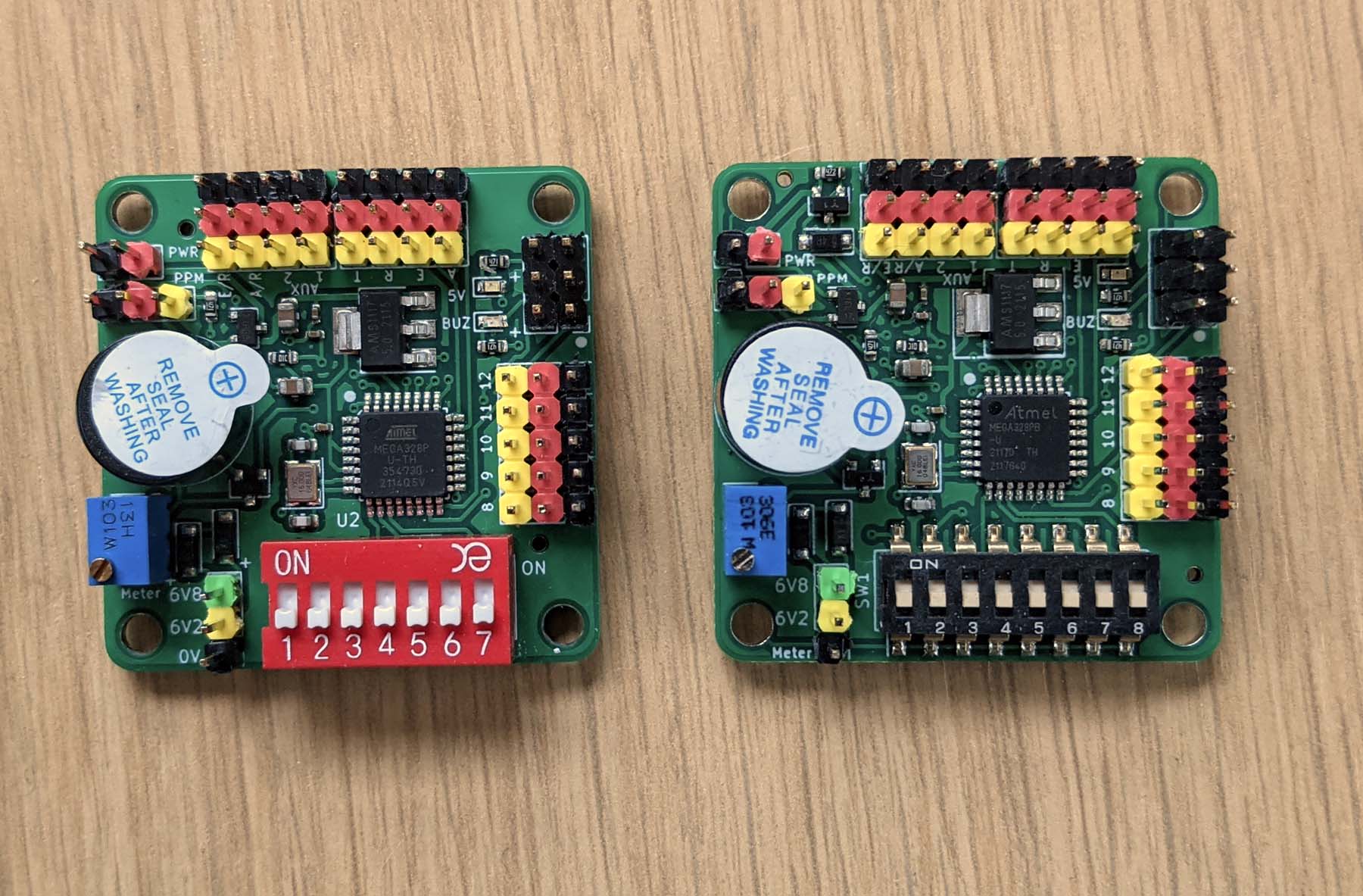 The encoder is on the left is a V1.4 version of my first design from a few months back (V1.2 and V1.3 never got made). Functionally it's the same as an Arduino Pro Mini and will run the Phil_G firmware or the F3A modified version without modification, but has reverse polarity protection, a gap between the row-of-8 connectors so servo plugs fit more easily and a pot' and two zenner diodes to make the battery meter display voltage. I prefer a 6.8V zenner and Phil prefer a 6.2V, so I fitted both! I tried to keep the cost as low as possible without cutting corners, so fitted a 7 way DIP switch instead of an 8-way, only 7 switches are used, so why pay for the extra way? It does mean that you have to remember that what was SW3-SW8 becomes SW2-SW7. I got JLCPCB to supply and hand solder the DIP switch, sounder, pot', ICSP header and all the smd components, it's cheaper than buying the same components in the UK and saves some soldering. And the hand soldering is as good as mine or Phil's, far better than Chinese hand soldering from the past. They don't do coloured headers (yet), so there is still a little work to fit the headers. I designed them for Phil and will be posting them to him shortly, so contact Phil and not me for availability.