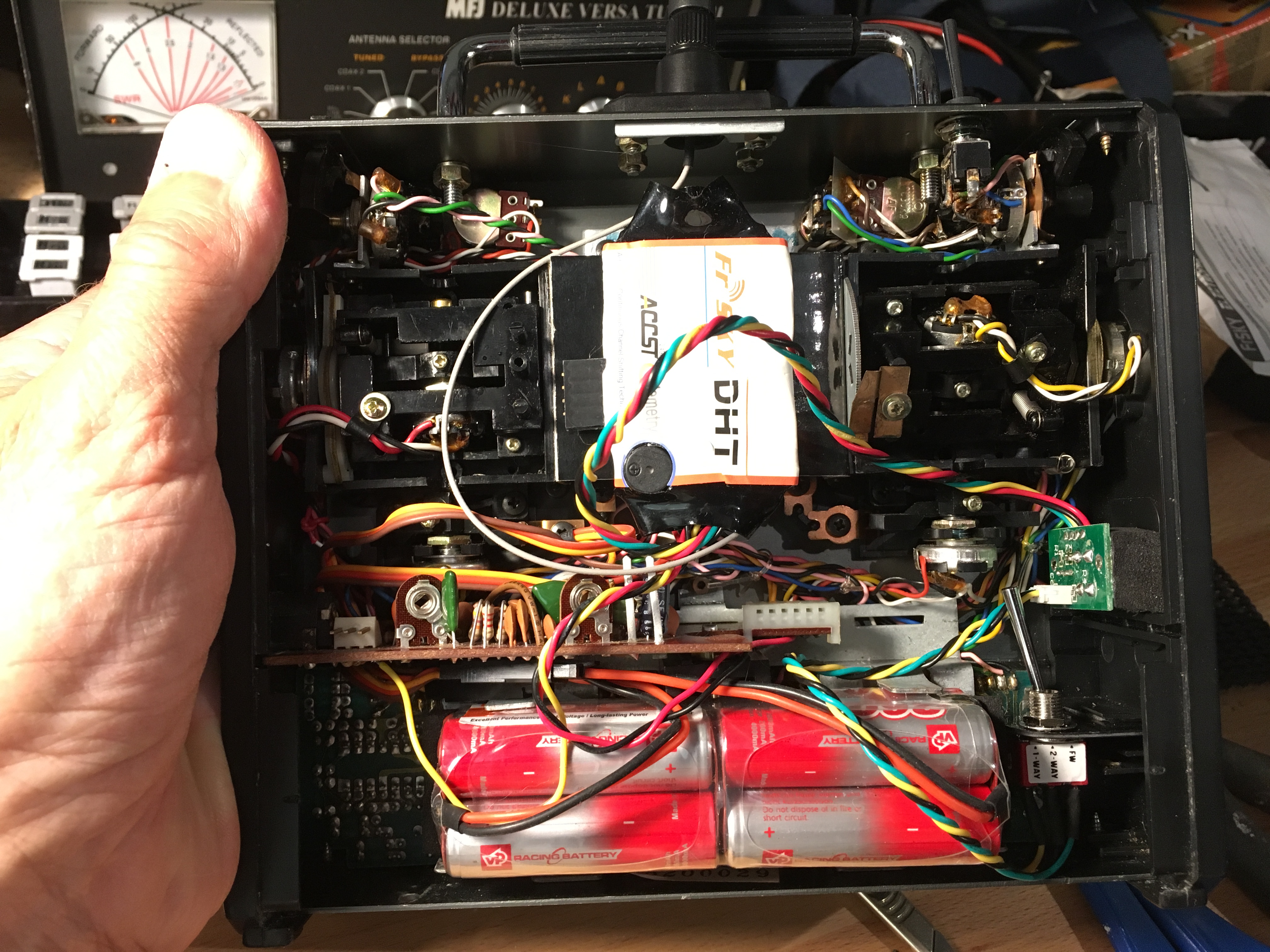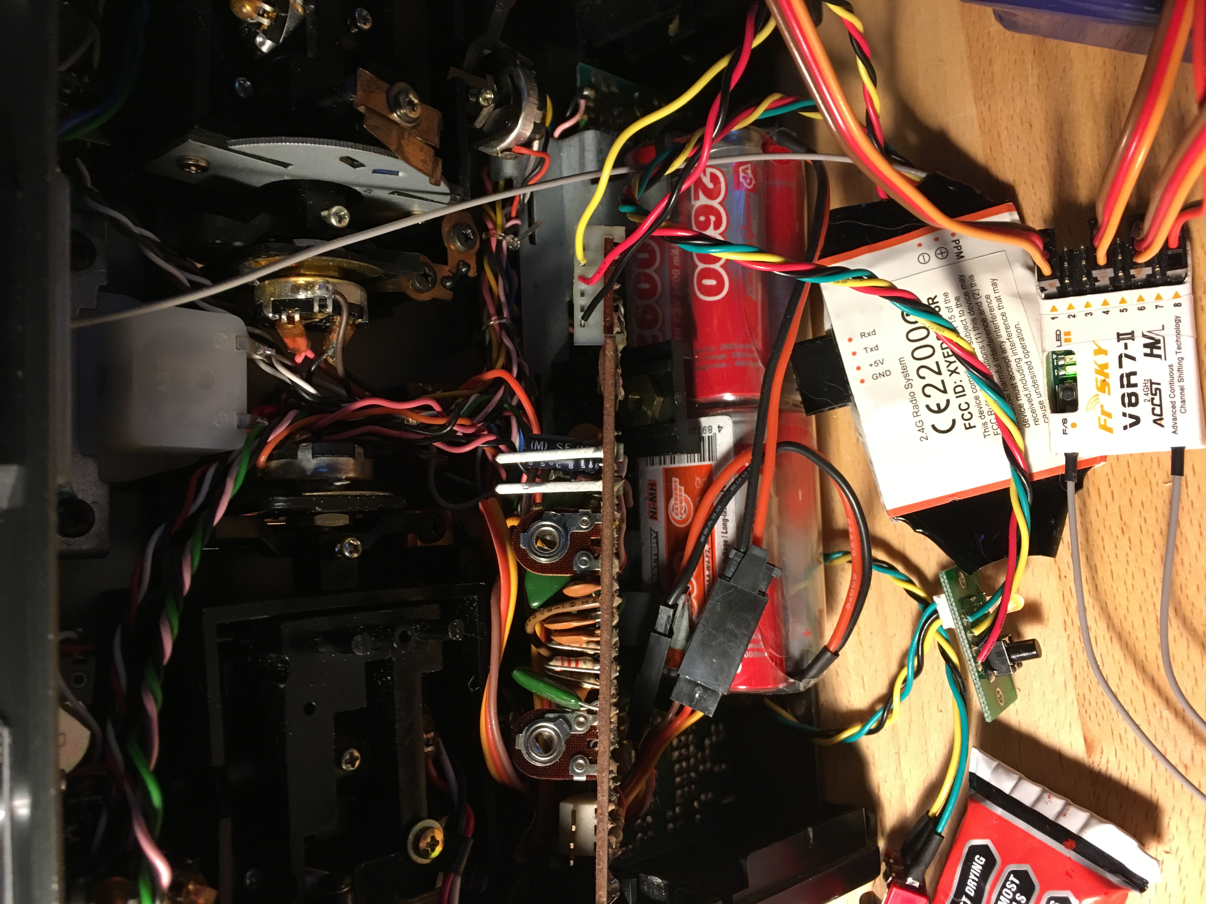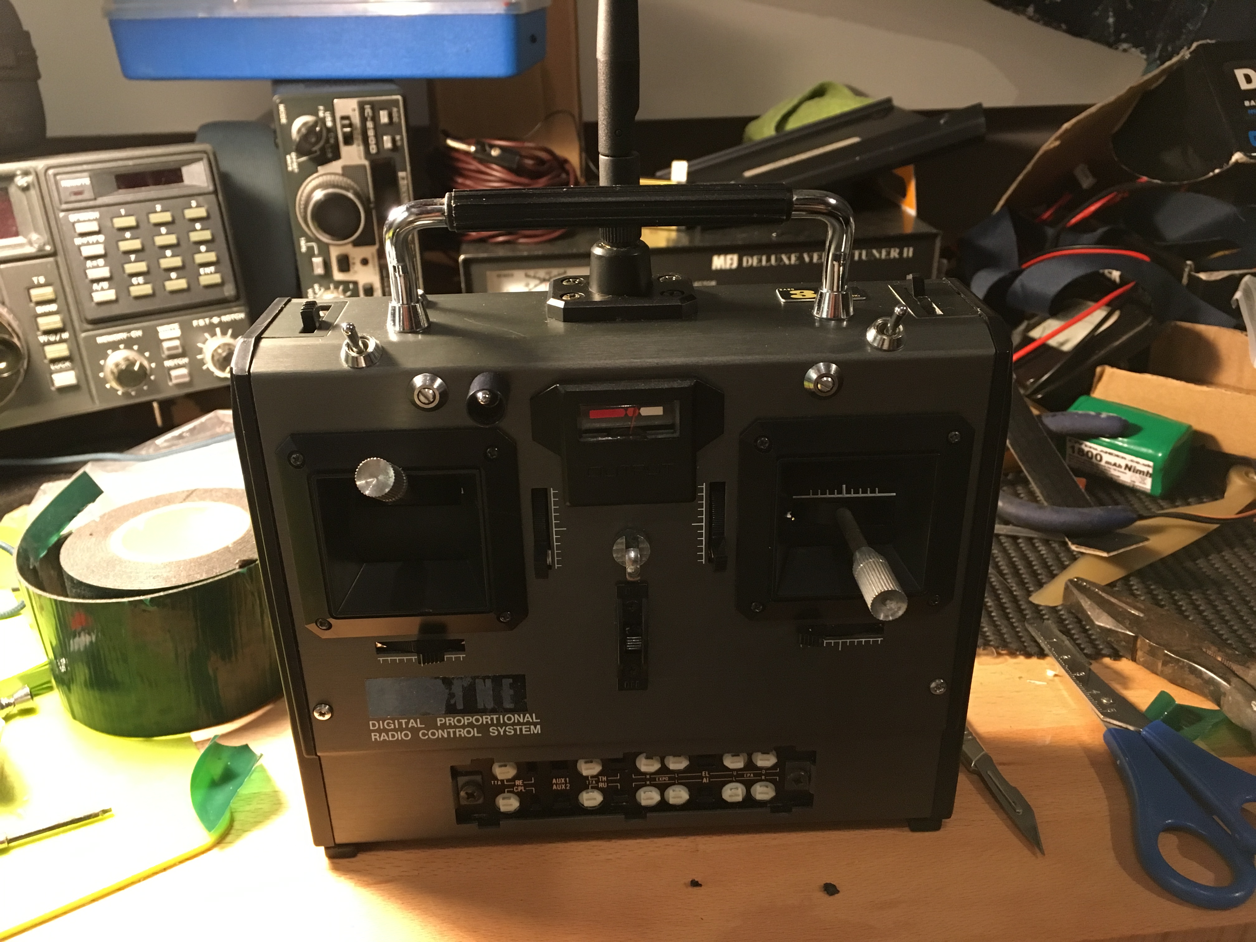 Completed transmitter. Bind button and LED sit recessed within the xtal hole. I kept the mode 1and 2 switch hidden inside - works amazingly well and locks on immediately with the rx very unlike my spectrum DSM2 outfits which I am not keen on