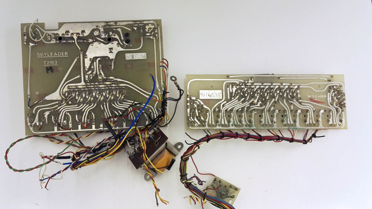 There's a Futaba M6 27MHz, Futaba FP-T6FN 72MHz (US equivalent of the UK M6), Futaba Digimax 5, Fleet Custom 3 FM 35MHz (black case), Kraft Sport Series 72MHz (1975 version I think), Skyleader Clubman 2CH 27MHz, Skyleader SLX 6 CH 27MHz and finally a Skyleader TSX 7 channel encoder board (sorry the rf board is being used by another project).
