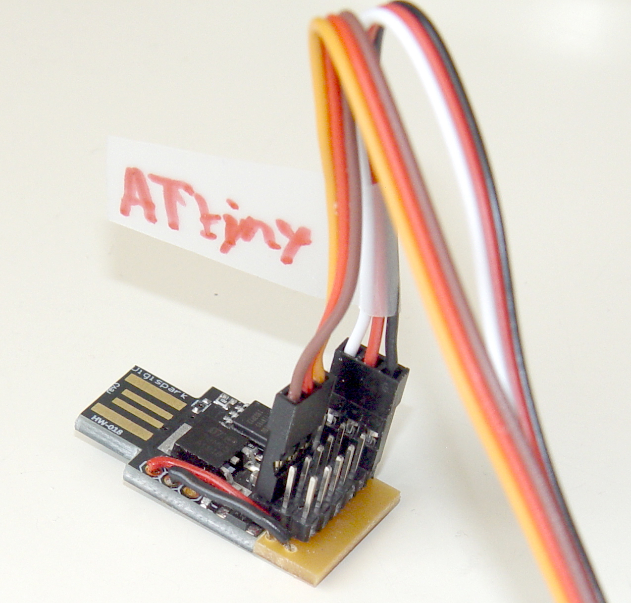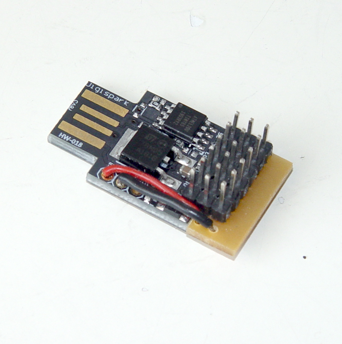 The Digispark, properly "defluffed" as per Phil's instructions, and extended with a strip of veroboard to connect the servo pins. The USB-tab will be hacked off later: