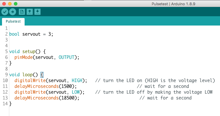 Next, I wrote a simple sketch using the standard IDE Delay() function, similar to the familiar Blinky, but with writeMicroseconds() set to 1500 high and 18500 low periods to create a PWM output. That worked, but things were not as expected: