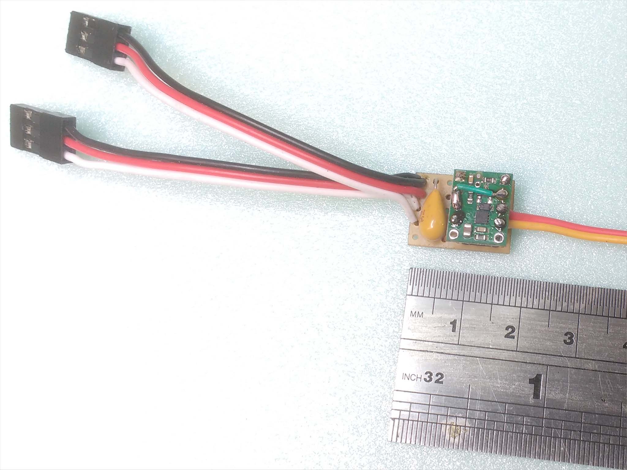 Tobes version which he supplies with the plug-&-play version is even smaller, barely larger than the PIC chip, and is neatly integrated into the actuator moulding. Whilst Tobe's P&P actuators are complete and ready to fly, the recoder PIC chip itself is available for DIY fans, email me, and the DRV8838 bridge comes from Technobots or Hobbytronics in the UK. US members try Mouser, Digikey or Pololu.