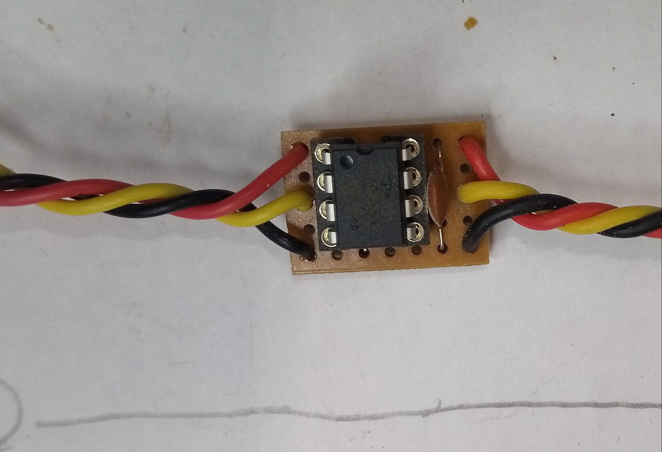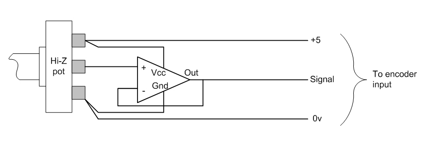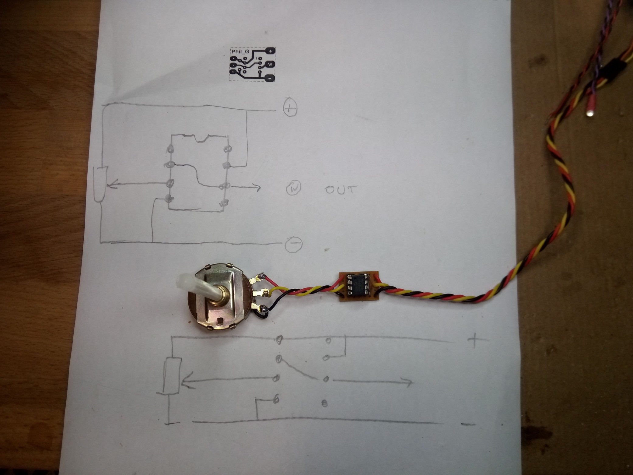 The result is it works perfectly, no different to a 5k pot, no noise pick-up or RF problems, it just works. I also did a small PCB layout (top of 3rd photo) to mount directly onto the pot tags. The buffer simply sits inline in the 3-wire pot cable, pos 5v, neg and wiper.