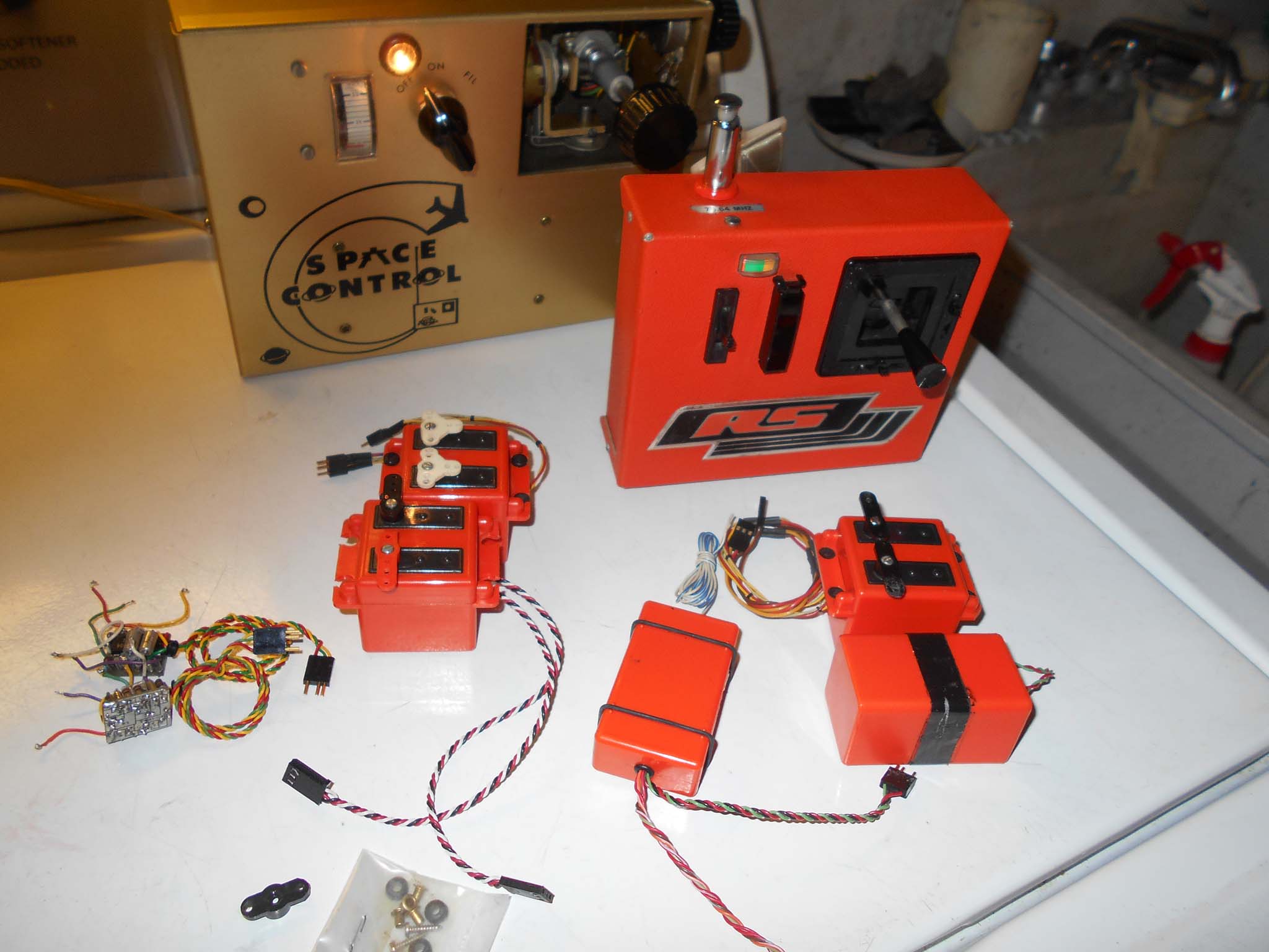 Here are my projects since I can't go anywhere or fly: A 1962 Space Control 4 channel analog proportional system (charging) and an RS Systems 3 channel set for a Hobie Hawk glider; note the cool 2-in-1 servo brick.