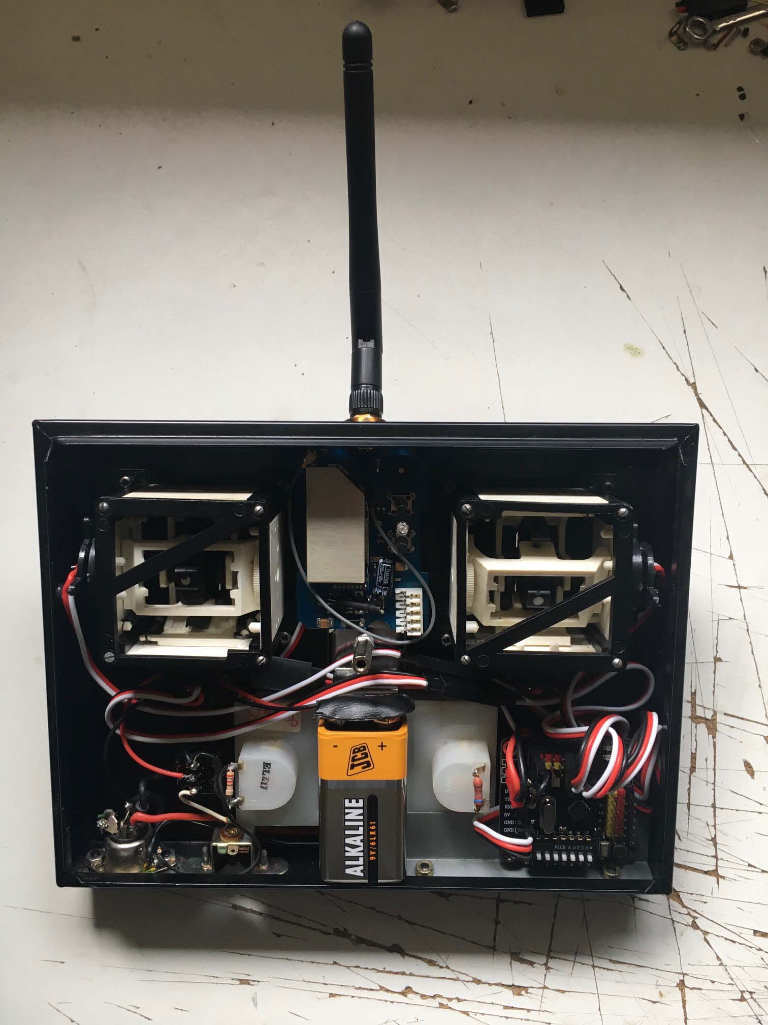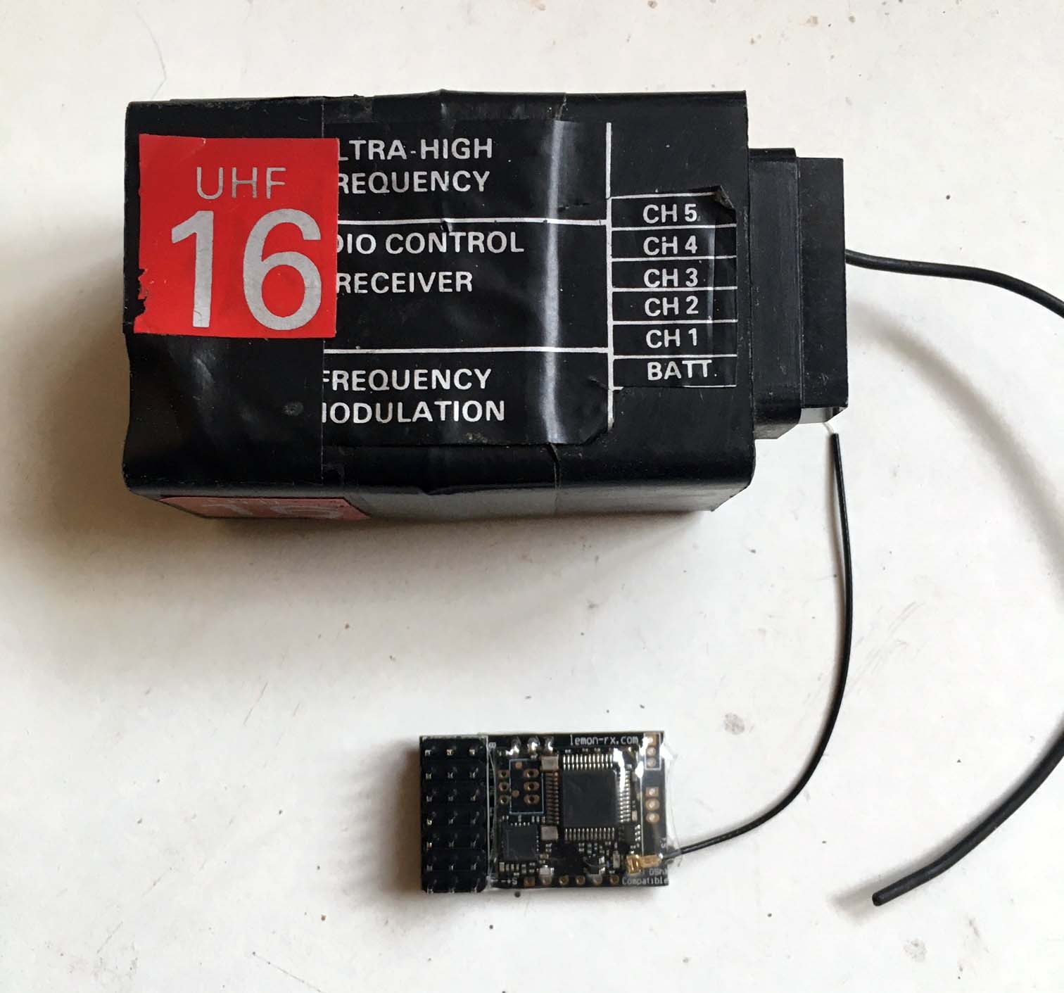 Below are before and after pics, I used an Orange Rx DSM tx module, removed from its case to reduce overall size of it, and of course the 'Famed' PhilG encoder boards stashed in the bottom right hand corner, along with a modern day dsm Rx of which I use, shown below along side the original enormous Reftec receiver, the Tx is powered by a 2s 7.4 volt LiPo battery ( I know there's a pp3 shown , that's been changed since pic taken) , and so far have proved to be enjoyable to use it and a doddle to set up ....