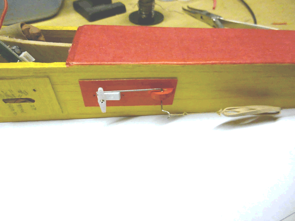 There are no sacrificial elastic bands to worry about. Re-setting is a simple matter of pulling the t/p back down to its flight position and re-setting the timer so that the servo returns to its "hold" position. That drives the pushrod back through the hold-down loop, and off you go again. I'd suggest using a 3-gram servo: you just need enough movement on the servo arm to ensure positive hold-down.