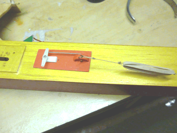 Note that the pushrod is only ever under tension, so rigidity isn't required and it can therefore be very light. At the tail end of the fus, the piano wire runs in a bearing comprised of a short length of brass tube.