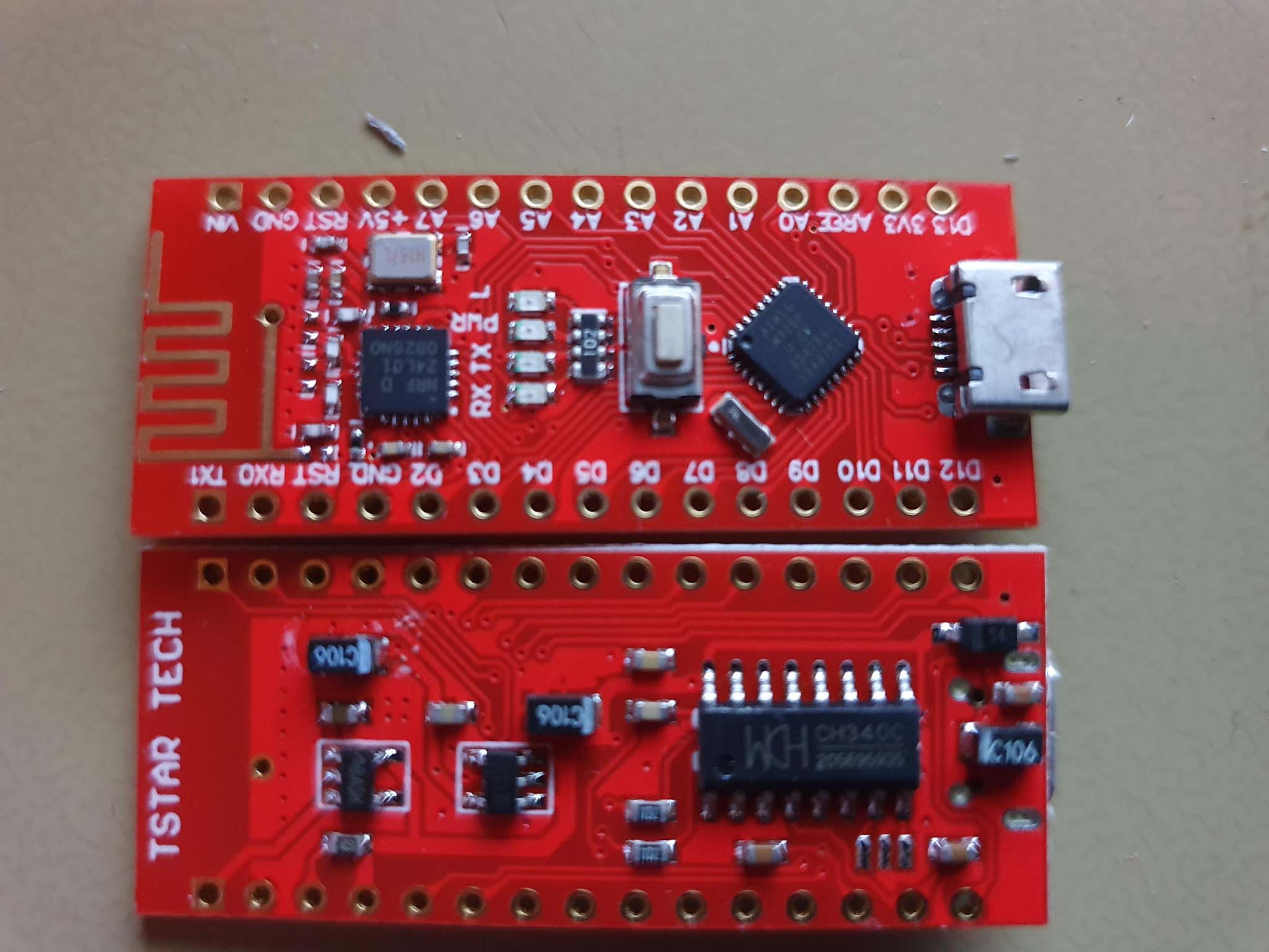 I tried one of Tobe's "Tstar Tech" RF-Nanos, the red PCB ones, and it didnt work, just filled the screen up with pixels. From previous troubles I suspected CE/CSN so stuck one under the microscope and traced them and found they're different to a Keywish RF-Nano, Tstar use CSN = D8 and CE = D7.