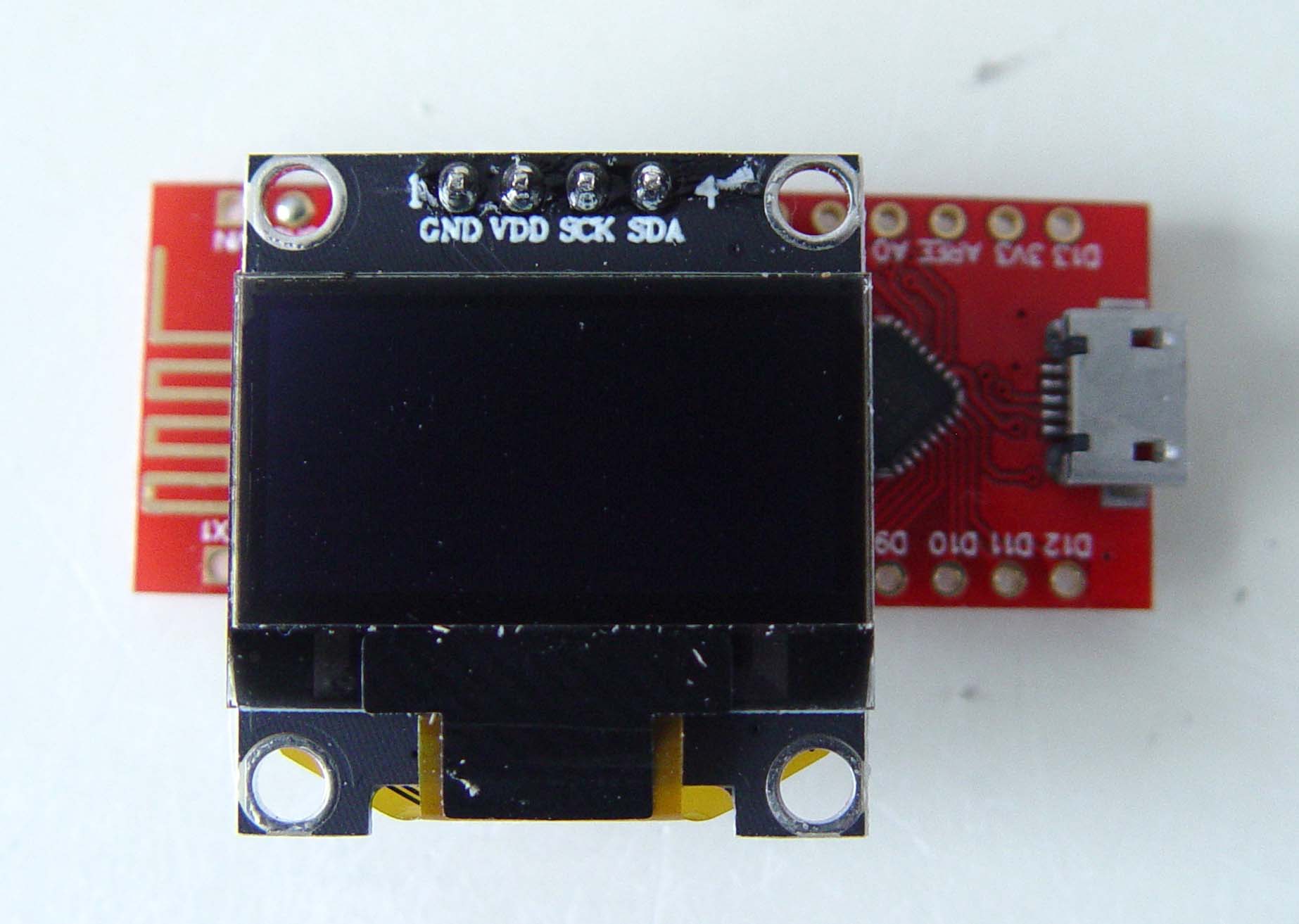 It came with the header pins soldered, so I mounted it directly onto the A4 and A5 connections of the nano. I borrowed A6 and connected it to 5V, same for A7 to ground, basically following the picture in the first post of this topic, but with Vdd and Gnd swapped as this is how my oled is configured.