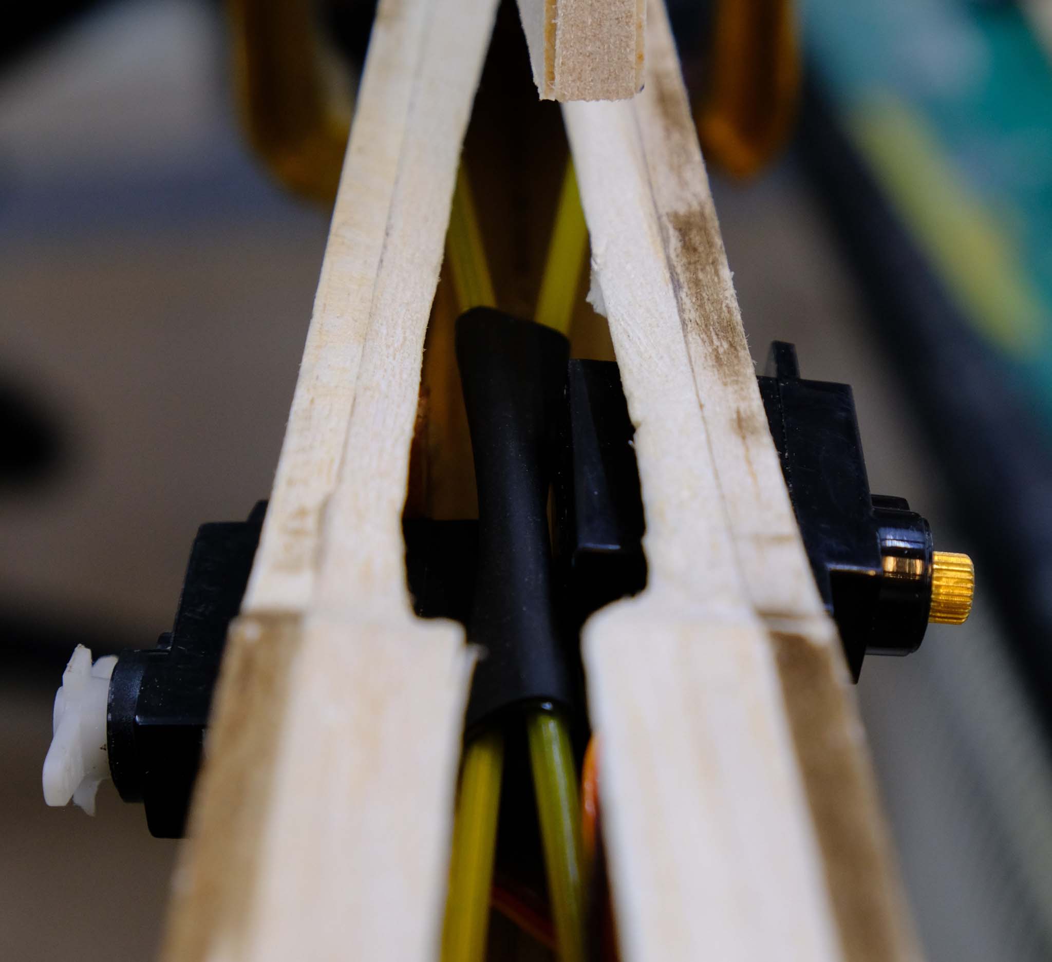Made up a long twisted Y lead for the rear mounted elevator servos and hot glued it in place in the rear fuselage so it doesnt rattle about.