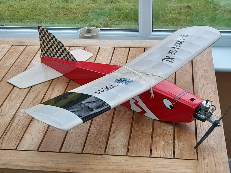 Back in day I built a normal sized Sharkface powered by a PAW 1.49. To say it was a hotship is an understatement but I loved the model so a few years ago, when I discovered Phil's wonderful s/c emulator and got into this Retro thing, the first thing I built was an electric Sharkface....... I quickly discovered that I am not as young as I was....... My reactions are slower and the thing was so small that in no time at all I could hardly see it! It now has a smaller electric motor but still I really haven't flown it much. I have long intended to build a bigger Sharkface but with the same PAW 1.49 as before. So Shaun's announcement that this year's "theme" was to be single channel, it was just the prod I needed........ 'Miserable weather this morning so I was forced to work in the shed....... and here is said Sharkface XL.