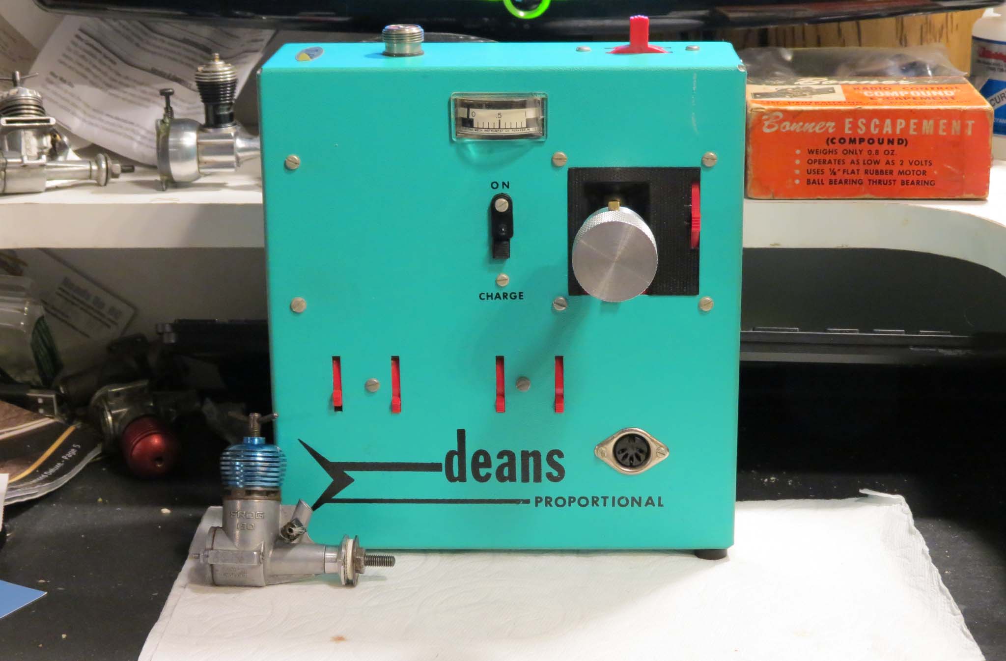 Since I'm an Exec Council member of the Vintage Radio Control Society, I received a phone call from a man near the southern side of Los Angeles. He found my name and number on the VR/CS website, and asked if I'd help him sift through his father's collection of vintage models. After most of the day sorting, he asked how much I'd like for my time. I assured him there would be no bill for helping him out. He rummaged around the back of his garage, picked up a box and handed it to me, saying "thank you and I hope you like this." I was quite more than surprised upon opening it and thanked him profusely. I didn't even know 'w s deans' made a single-stick, and here it was, complete with receiver, servos and a dead battery: