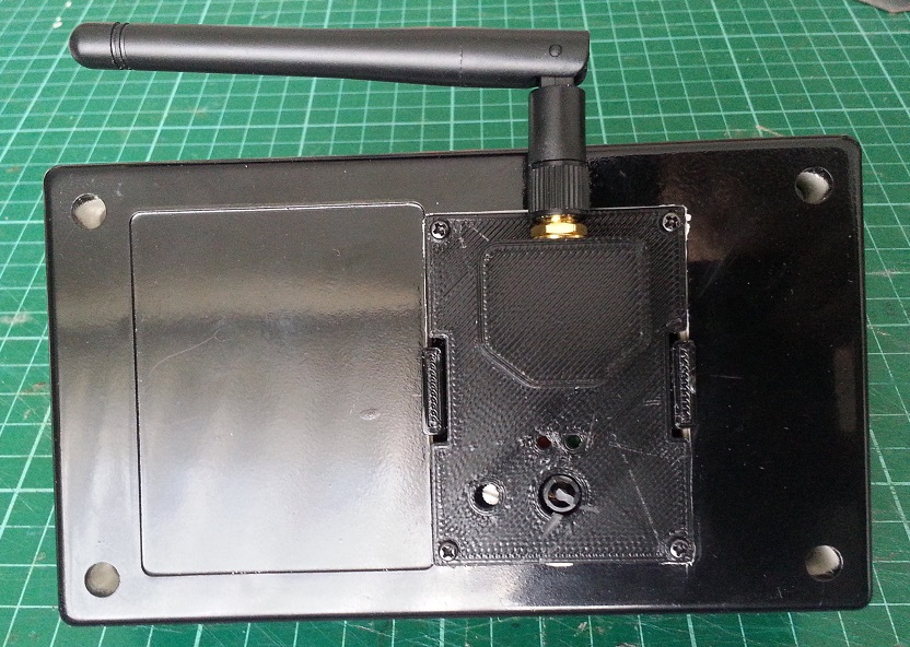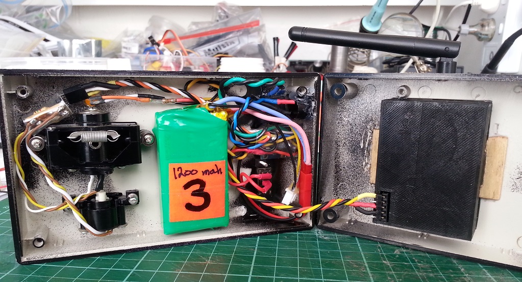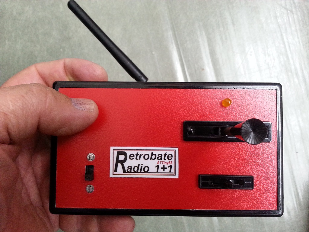The case is a bland neutral coloured cheap plastic job off 'the bay'. Since it has a shallow recess on the front, I inserted red stick-on auto vinyl in the recess after painting the case black. This colour combination reminds me of a 7ch Micron Tx I have tucked away in a box in storage. I used a D&R stick with a separate D&R trim pot. The encoder is Phil's ATtiny 1+1 Mk2