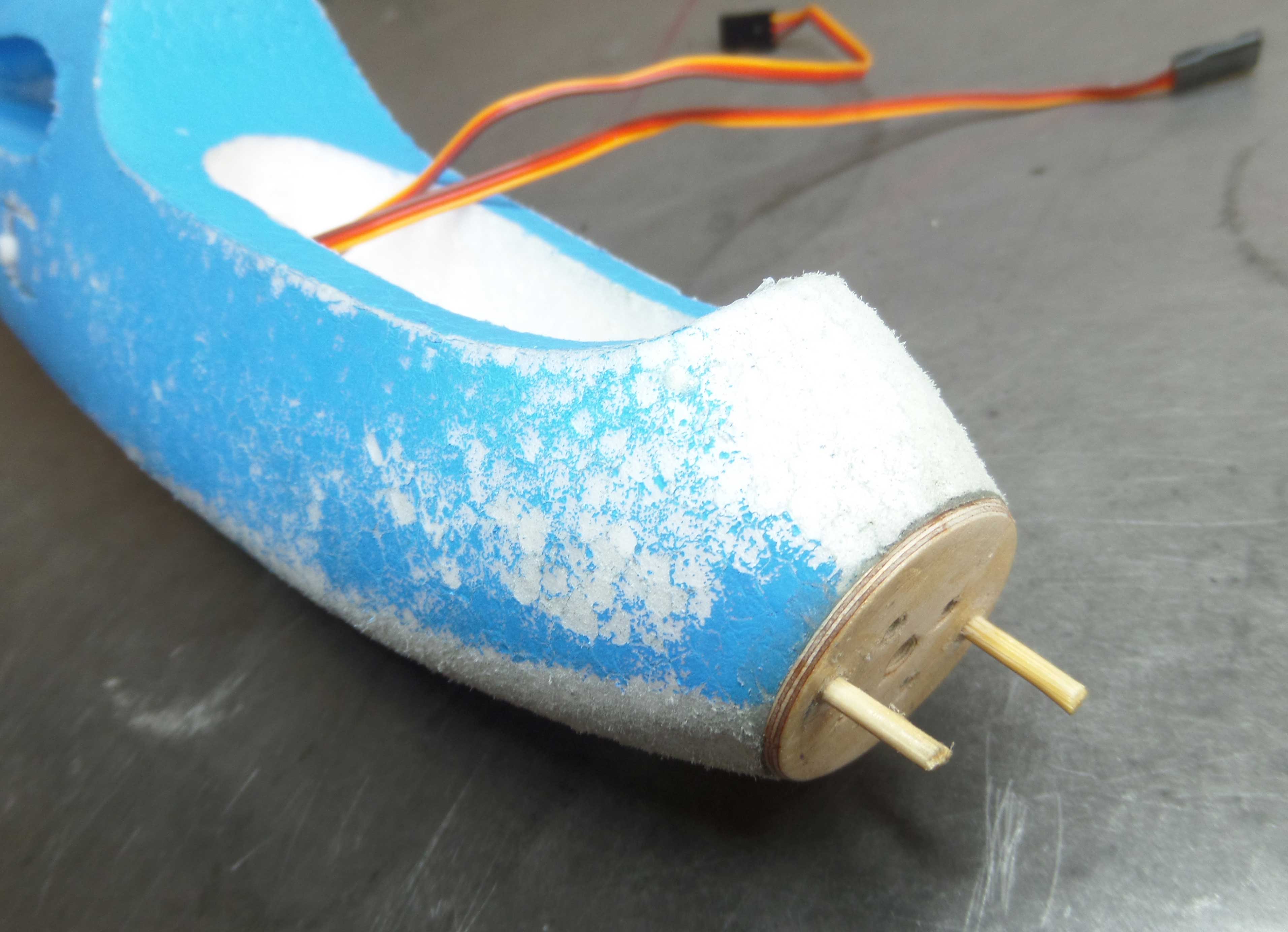 the control point is 7mm from LE (29 mm from pivot). 2 x servos taped together. servos slide into fuse. ply firewall with bamboo pins. motor is a 1306 3100kv (I cut off the ally 5 mm prop shaft and replaced the 2 mm shaft with a longer one). Specs: