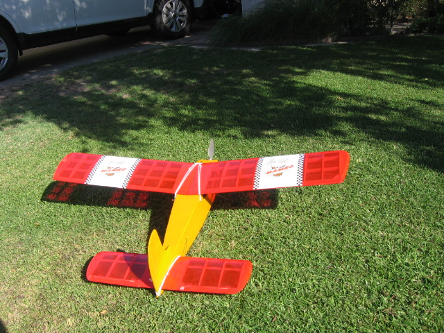 I used Sig Cub yellow dope and red translucent wing and stab covering. Wing logos were on Outerzone with plans and patterns. Had Callie Graphics make the original Sterling Wing Logos. Power is an old Thunder Tiger .10 brushless motor and 2200 mah 3S lipo.