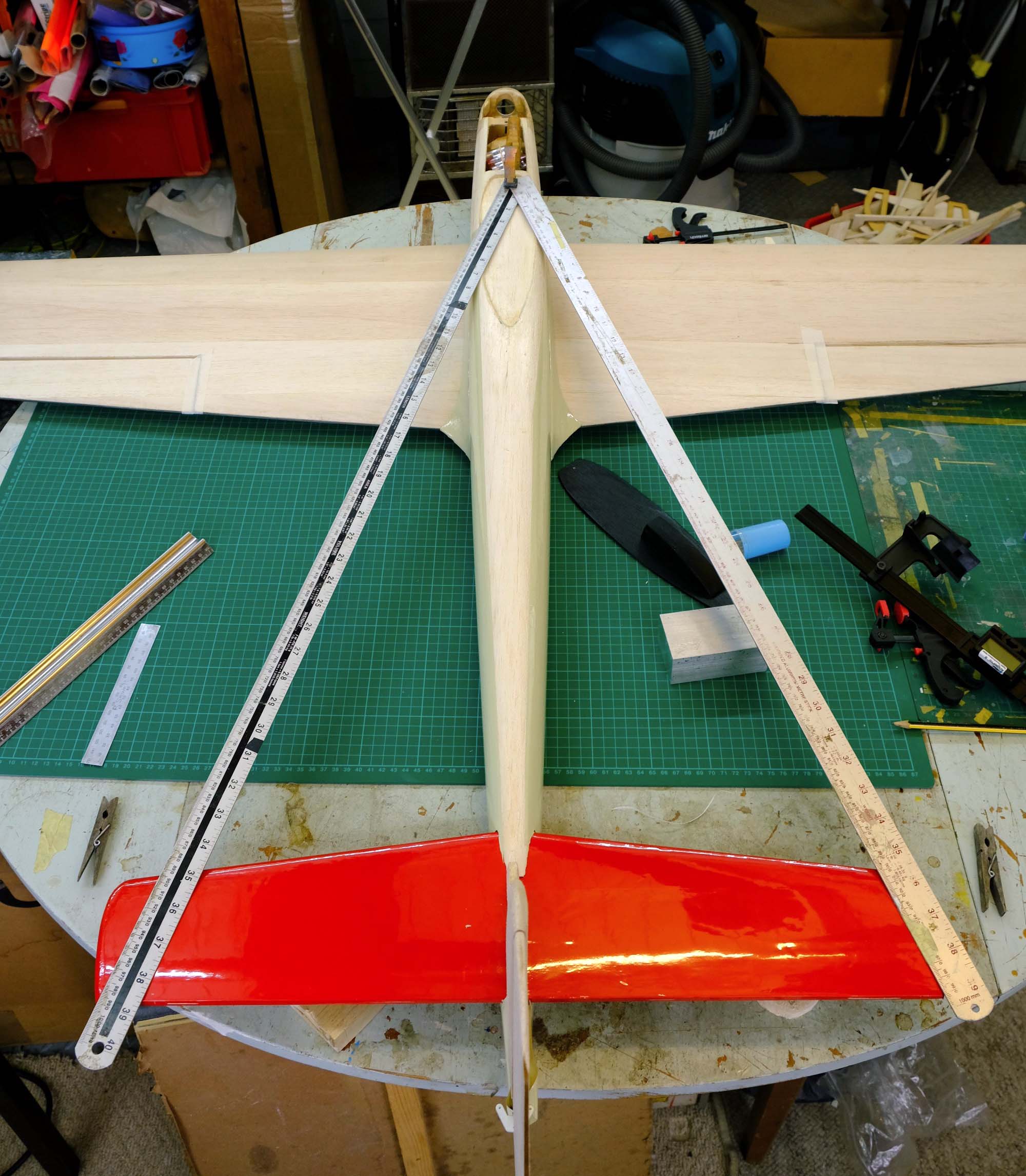 Testing the alignment was ok was made using my two metre rules clamped to my fuselage datum point (see pic) Only a small amount of adjustment to the fin post was required to get vertical and longitudinal alignment spot on.