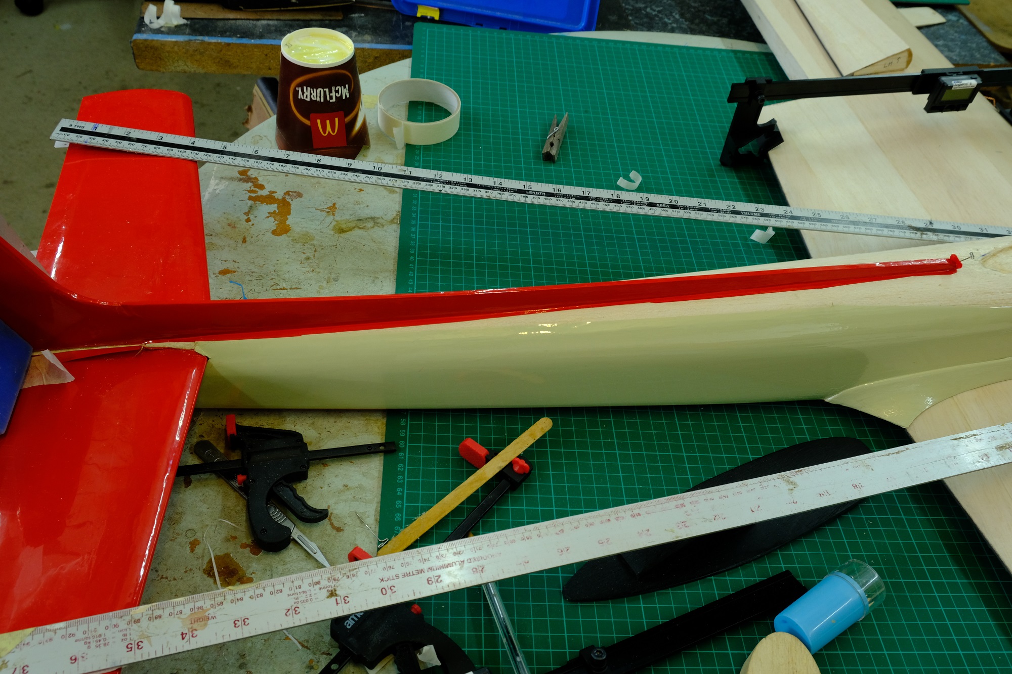 More measurement and cutting away the covering on the stab underside and it was out with the 30 minute epoxy and go have a cuppa and write this!