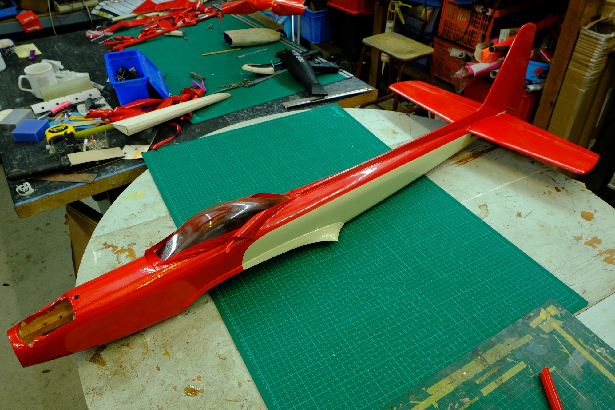 Next step was to get the top and nose of the fuselage covered and this proved quite tricky as I was starting to get o the end of the available red oracover! I managed to rescue the forward nose piece as I had a bit of a schoolboy problem and allowed the curved portion to get itself stuck to itself, but as you can see it all worked out ok and just leaves the finishing off around the canopy to do now.