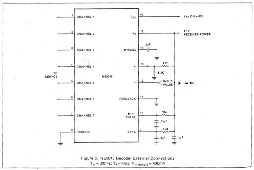 The 5045 sync pause can be adjusted if necessary, but my i10-iA6C combo runs a 20ms frame, and I seldom use more than 5 channels anyway. I built a test circuit with 50K pots in place of R9 and R10, to optimise values to the nearest std. value, and the V/D pair at pin 13 can make fine adjustments to the comparator switch point.