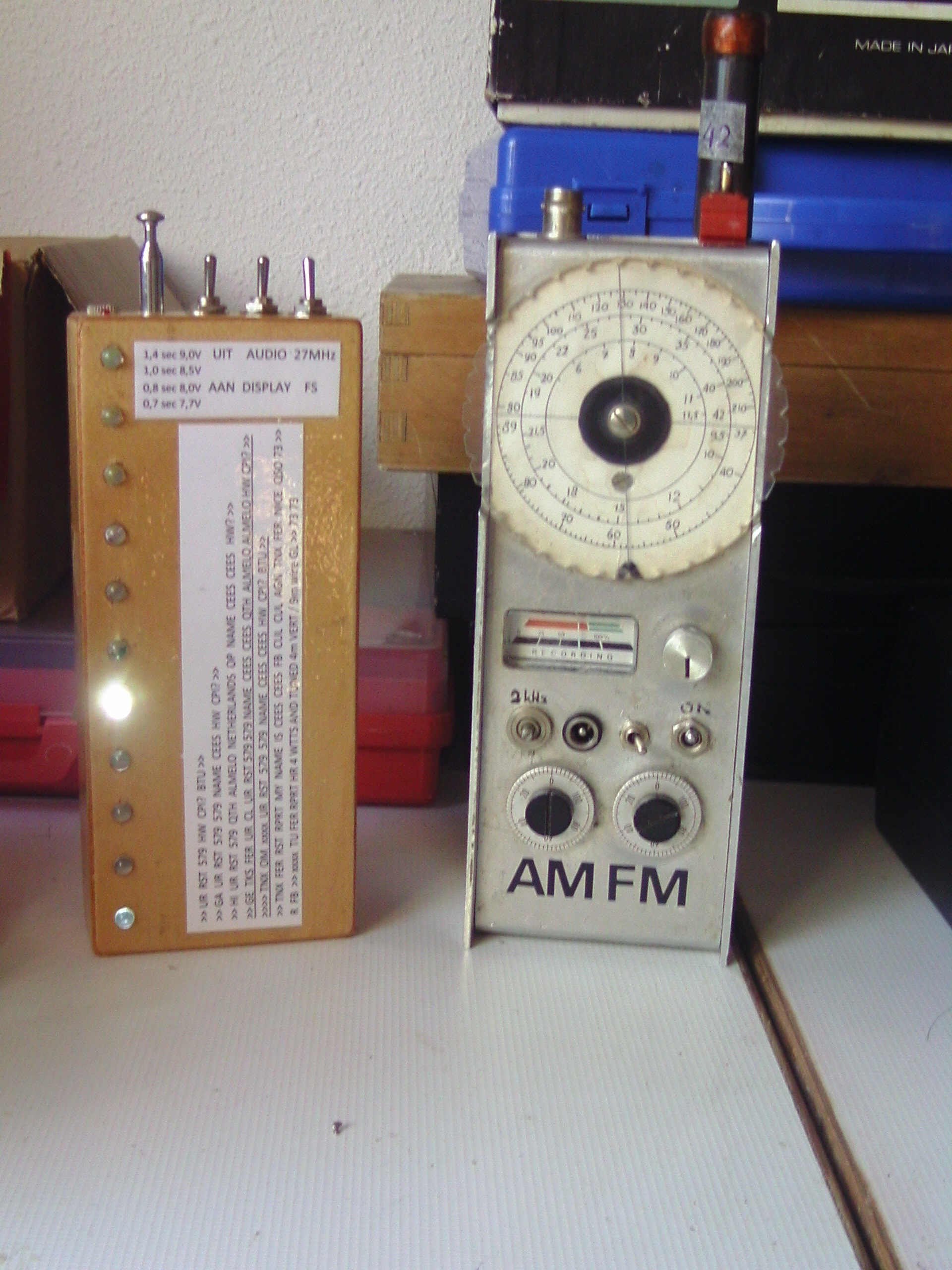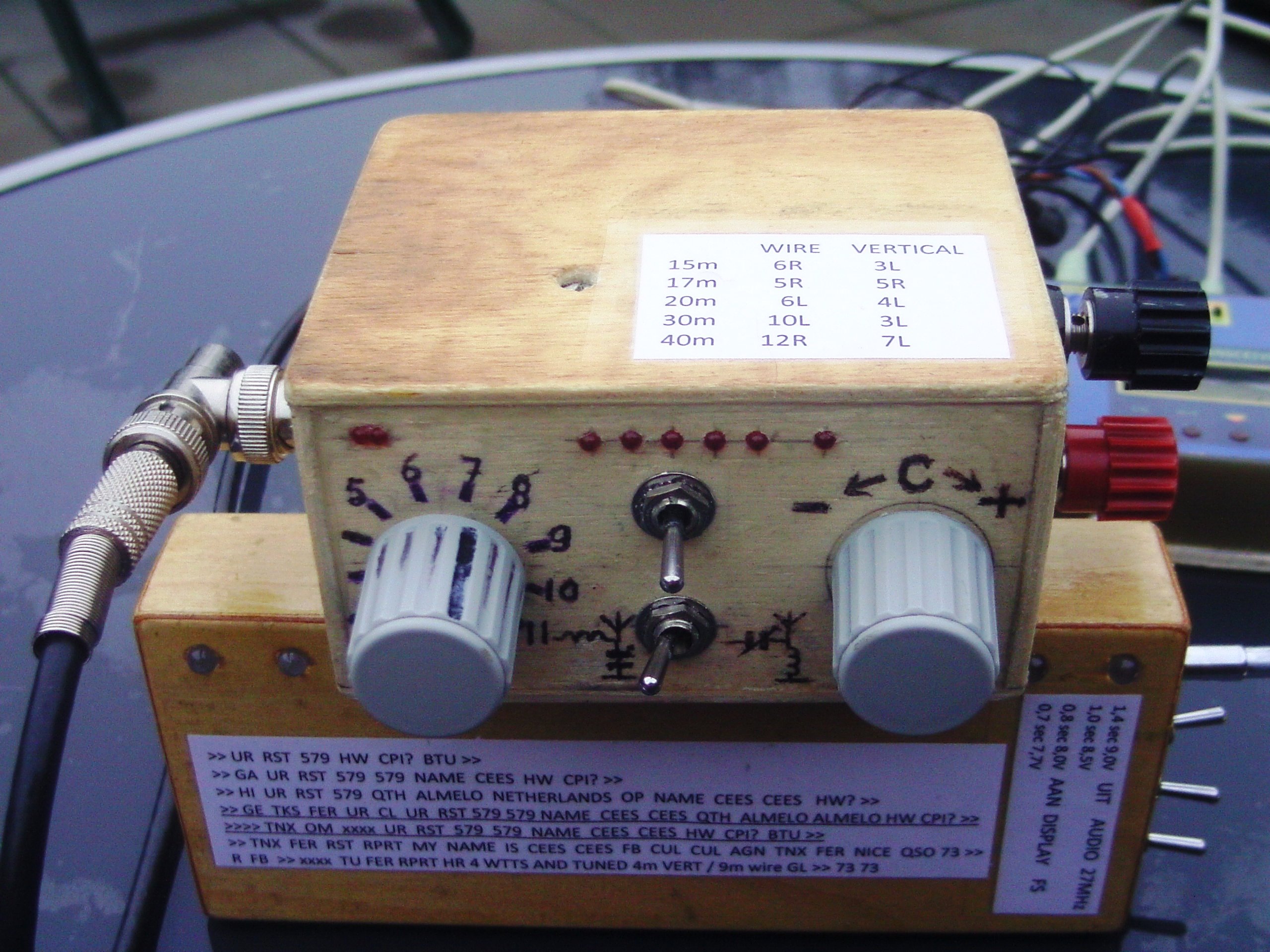 This is my rig next to the 40m transceiver I showed earlier, a 5 band QRP morse Mountaintopper CW transceiver with an output power of 4 Watts maximum. I now temporarily use a vertical in the house, about 3 m long on the first floor. Made another QSO with Croatia this morning, 1250 km. I designed the antenna tuner for this rig. As a tuner with a bridge for SWR measurement, it has always been a safe load for the transmitter. The SWR measurement works on the power of the transmitter, so does not require a separate power supply. Once the antenna is tuned in, switch off the SWR bridge and the antenna is directly coupled to the tuner. The fied strength meter I use for fine tuning. The morse key works with iambic B.