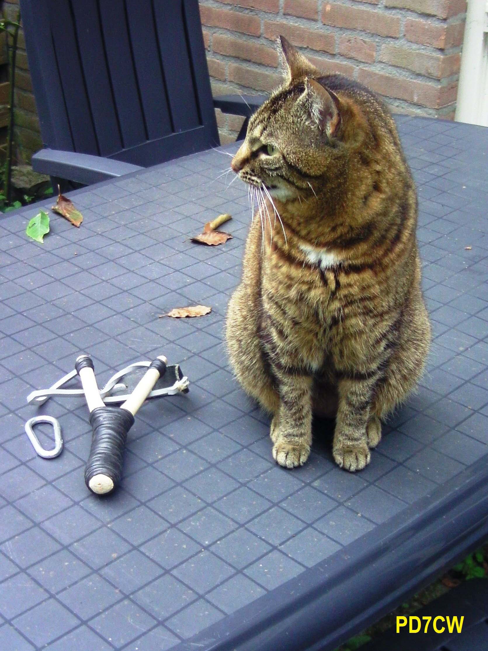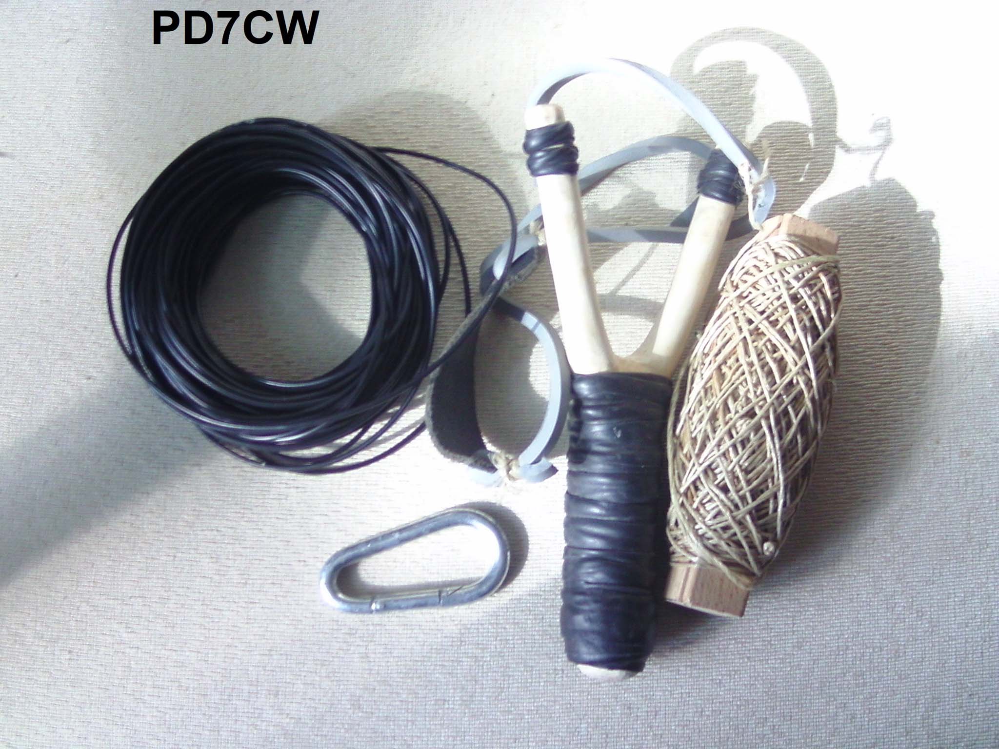 I first unwind about thirty meters and put it in eight shape in front of me. I use my catapult upside down, the handle on top and the fork on the bottom. I tie the carabiner to the end of the rope and shoot it over a branch of the tree. Then I first use a small pulley with a rope attached to the carabiner and pull it upwards and then lift the antenna. The pulley makes pulling down the antenna and pulley easier. I don't have to pull it back over the branch with the risk of it getting caught. First I lower the antenna and with the double rope of the pulley I pull the first rope out of the tree.