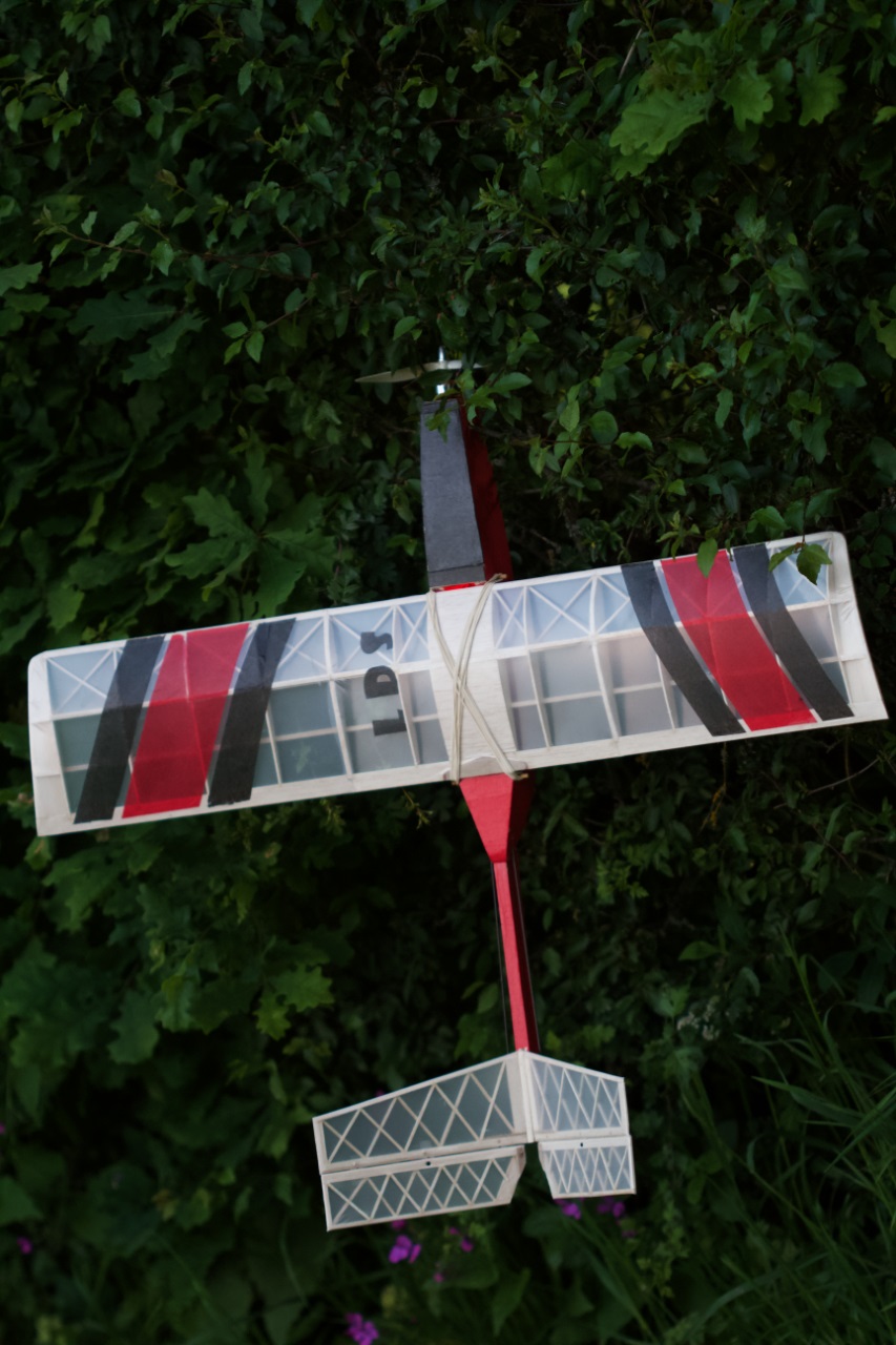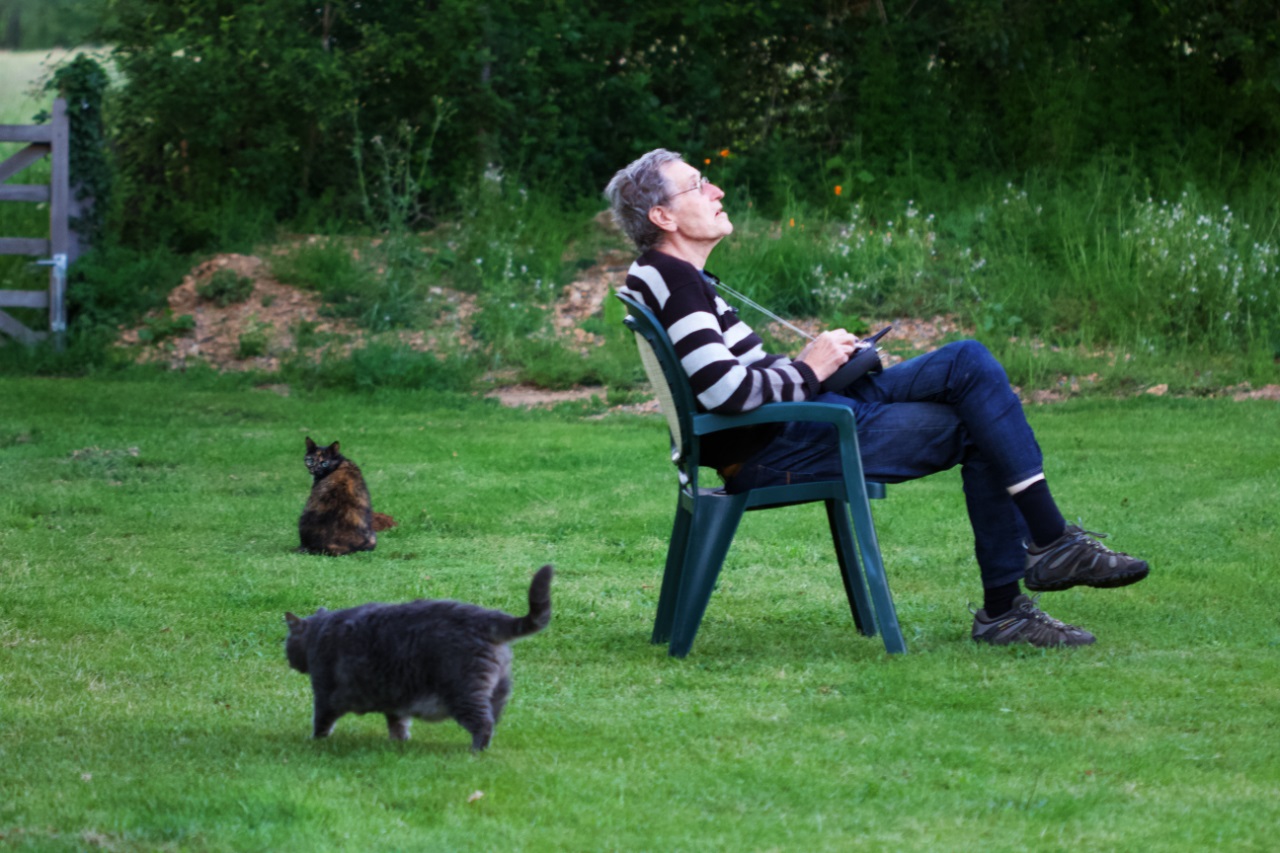 Depending upon how things go, there is a possibility of some easing of our restrictions after May 11th, including rescinding of the "within 1 km of home" rule and allowing of small gatherings of less than 10 people, observing social distancing of course. So flying trips to our field at Vayres COULD just be on. Meantime I am flying the Lock Down Special from the garden at every opportunity and had an inspiration about the safest way to "land" it - just let it glide into the soft and accomodating boundary hedge - simples! Depending upon the speed of entry it either finishes up horizontal with the back end sticking out, or, as in the photo, hanging by the prop. Either way no damage results! In the other photo you can see that I have now learned to relax despite the tight flying environment, and also note that our cats have been trained to observe social distancing!
