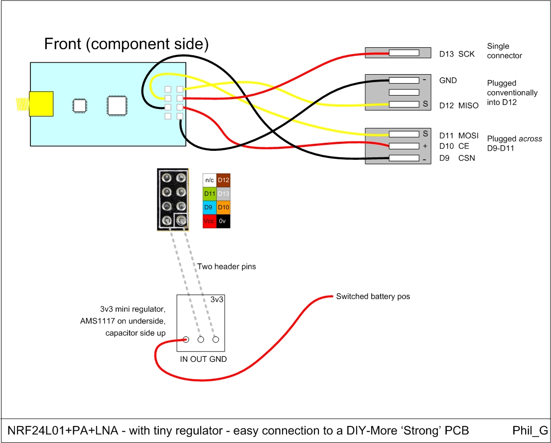Thank you for your encouragement with the project, and for the regulator idea, I do have some but it didnt occur to me to use them with the transmit module! Its a great idea as the 0v and 3v3 pins align, so the regulator can sit rigidly on two header pins. I must remember to solder the NRF wires first though, they're harder to get to once the reg is in place.