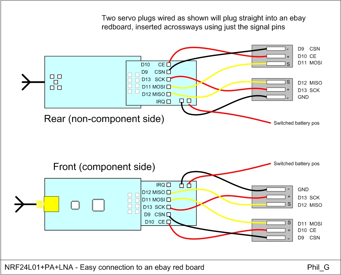 I made the NRF connections exactly as the diagrams in previous posts with a 'sideways' servo plug: