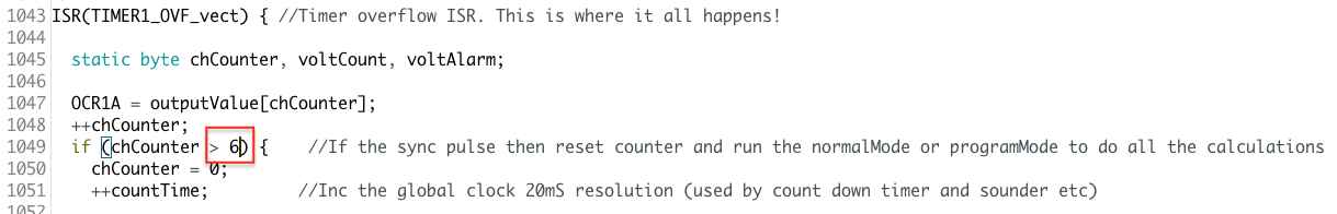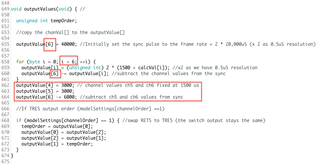 Don't know if you have read about my problems with the Flysky RF module ( viewtopic.php?f=62&t=695), but I have a hunch that the 4 channel format of the ppm stream is the culprit. Preliminary testing with a 6 ch source has shown some improvement, so I have modified your sketch to a 6 channel output. Can you please check and confirm that the changes below are all that is required, and I have not overlooked anything?
