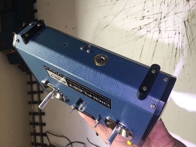 And underneath the bottom where the original din socket was, I made a brass plate and mounted an easier to use dc jack charging socket, power supplied by two 18650 li-on giving 7.4 volts , adequate to run the system well...