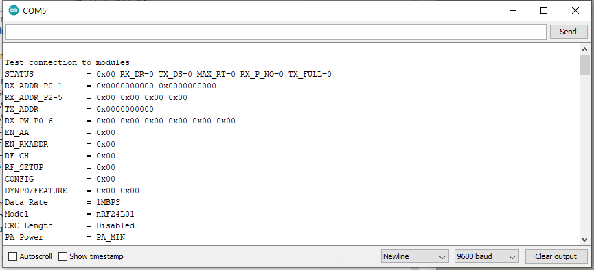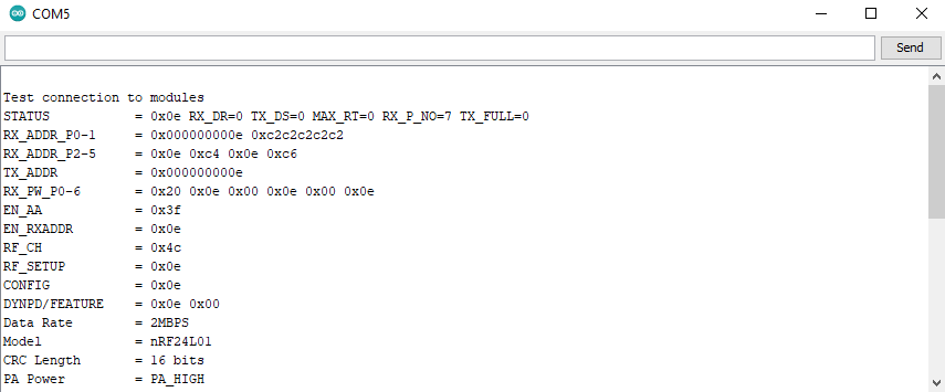 Yes TX is Com5 and Rx Com 4. Those data rates do look like a smoking gun! Although I bought them both from ebay, one reports to be an NFR24L01+ and the other a plain old NFR24L01. Looking at the net, it appears these can be run together, but you have to get the data rates identical (https://www.seeedstudio.com/blog/2019/1 ... ta%20rate.)