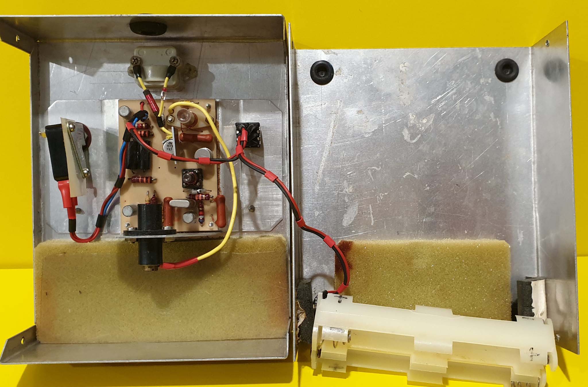 This Skyleader on first examination is in mint condition. It doesn't appear to have ever been used in a diesel/glo/petrol model. The inside is just as clean. There is a cap on the top of the case to facilitate changing plug in crystals, which I think marks it as a later model? Does the serial number on the PCB provide any clues Mr K?
