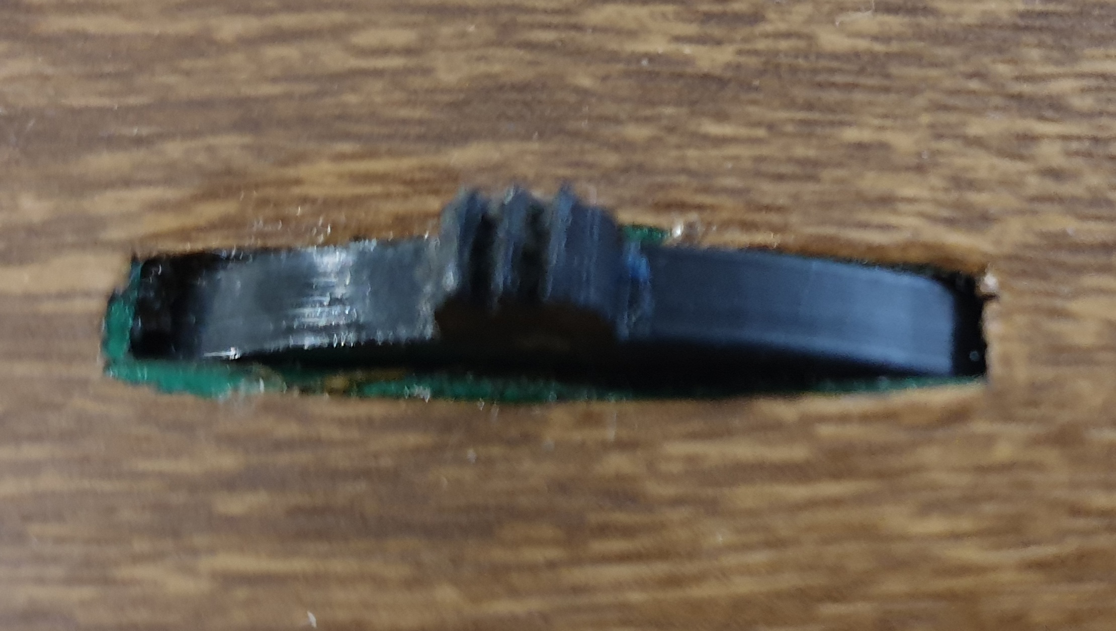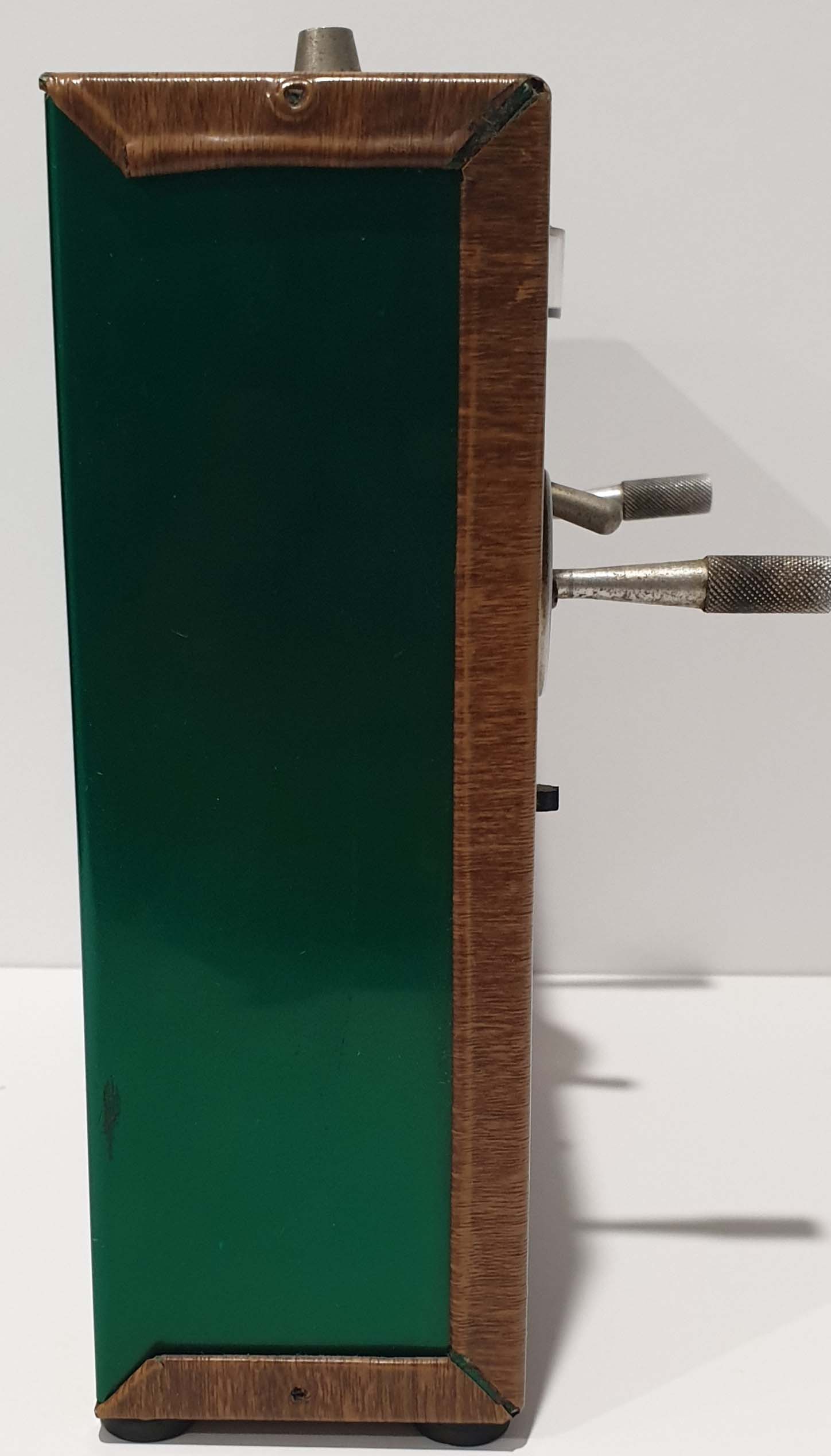 The case front and back is anodised green, the woodgrain vinyl being added later. Compare these pictures: