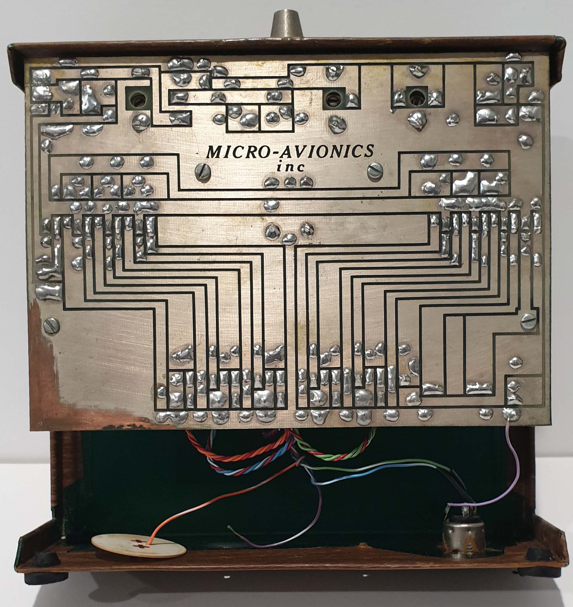 The originals were all green, with the green and silver border logo on the front. The circuit board is from the 1st version of the Micro-Avionics and is a beautiful example of Don Mathes work. The wood grain is going the wrong way on yours, as it was oriented vertically on the originals.