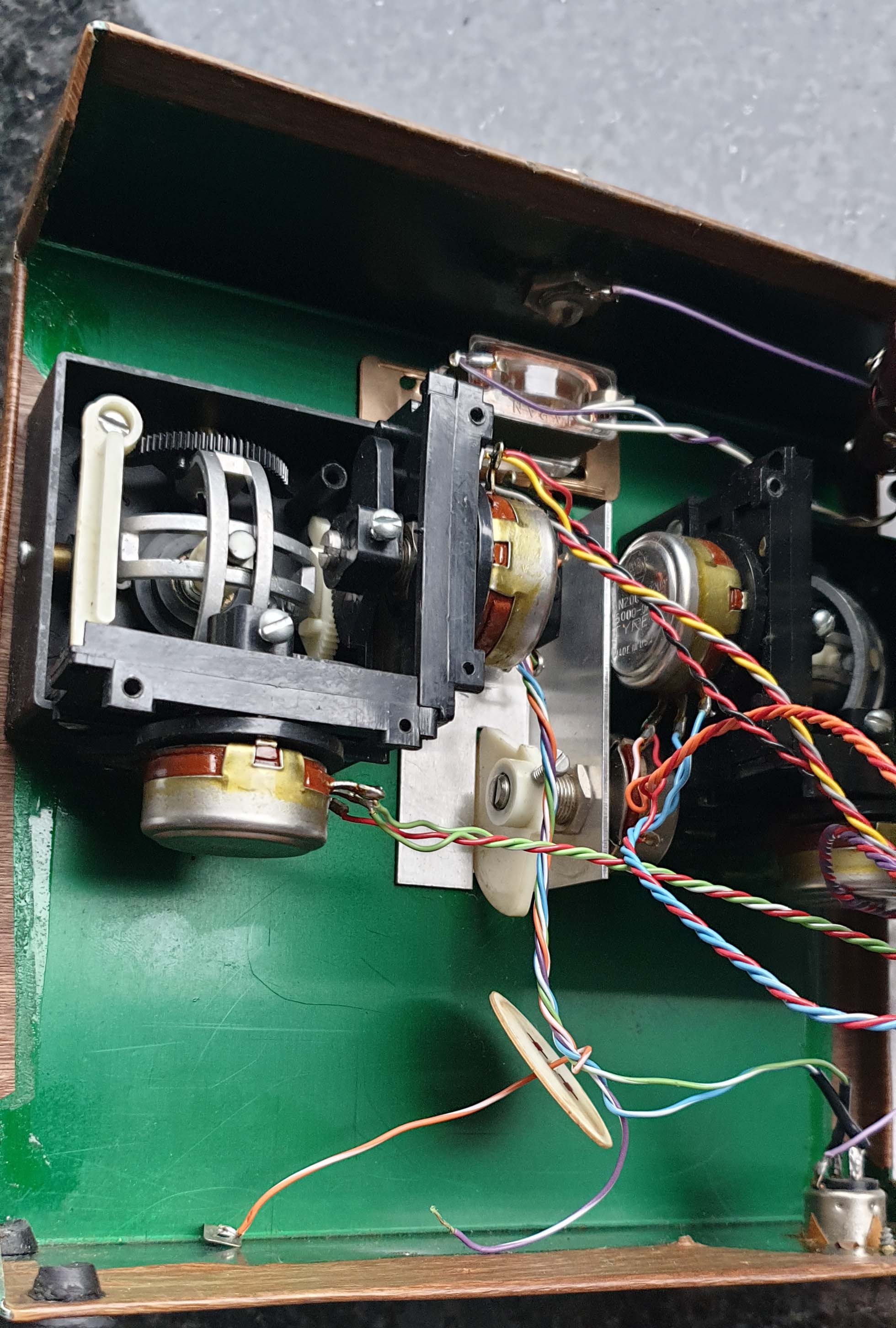 The stick mechanisms are different to anything I have seen before. They use a geared arrangement to drive the pots, and a flat wound centering spring with two fingers. My intention with this one is to gently heat the vinyl to hopefully remove it a bit easier. If the green anodised case can be cleaned up, I'd much prefer to have it rather than the vinyl clad version