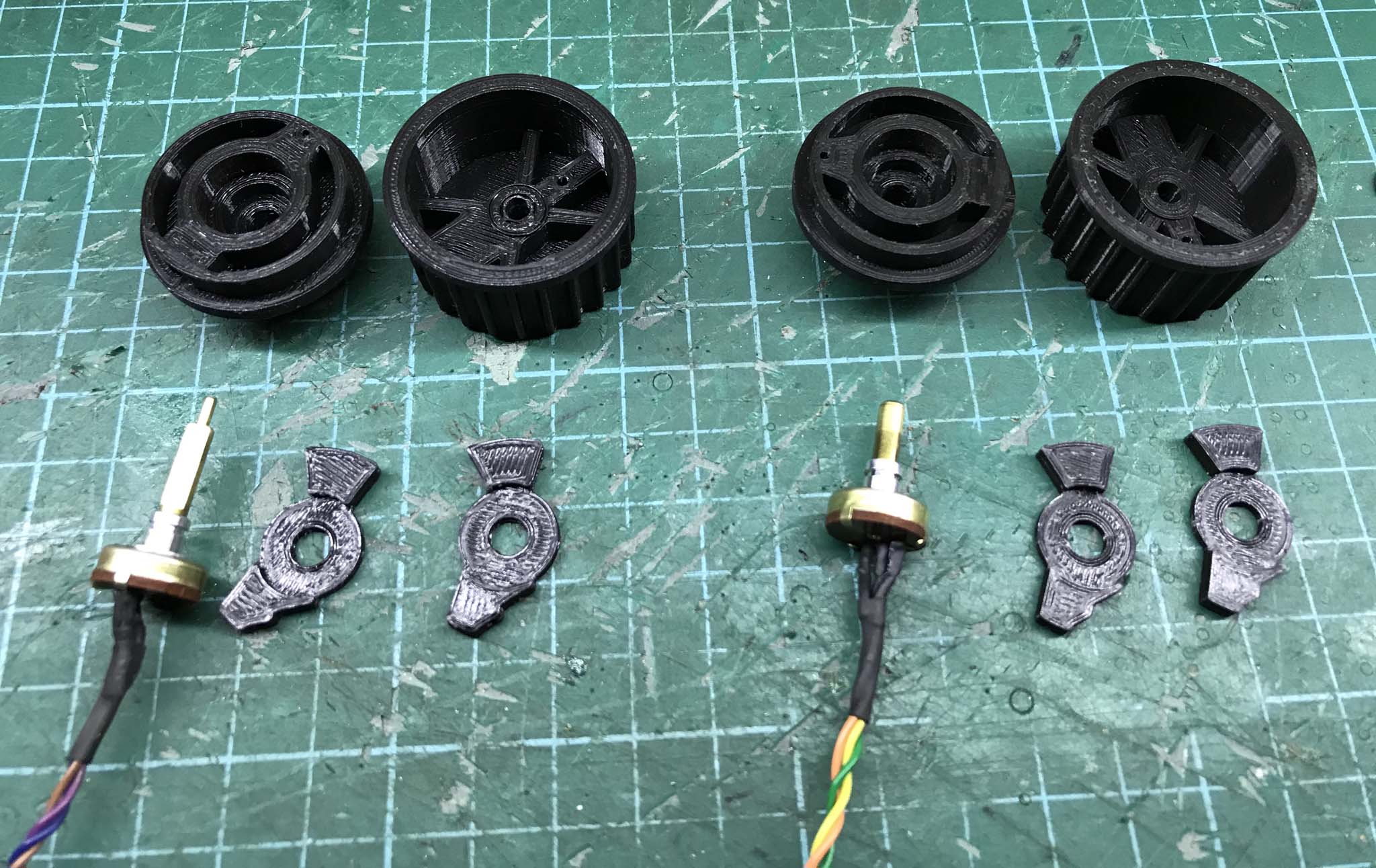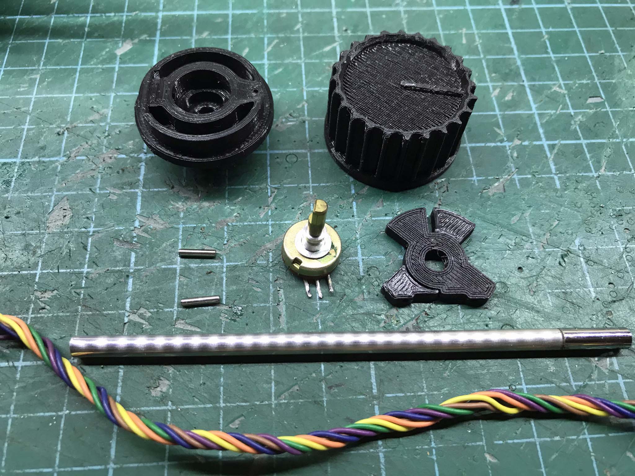 Printed knob parts, pins, pot, hollow shaft...ready for assembly...spring next.